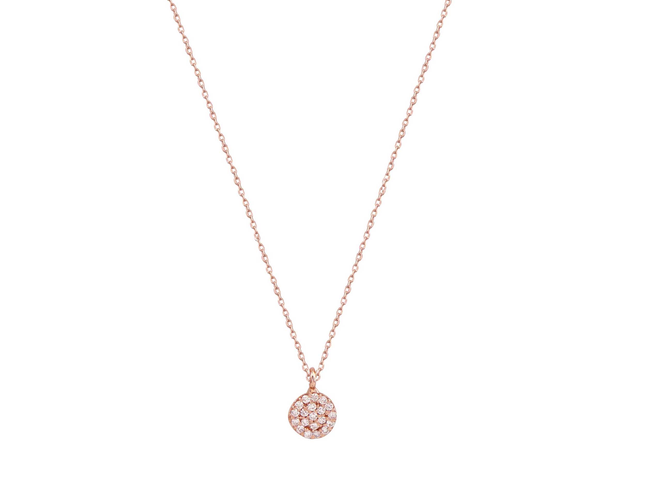 Μοναδικό μενταγιόν ροζέτα ροζ χρυσό 18 Καρατίων, με λουστρέ φινίρισμα και αλυσίδα μήκους 40 cm. Κοσμείται με 20 λαμπερά διαμάντια κοπής round brilliant. Κομψό κόσμημα, σε διαχρονικό σχέδιο, που θα συνοδεύει κάθε σας εμφάνιση!