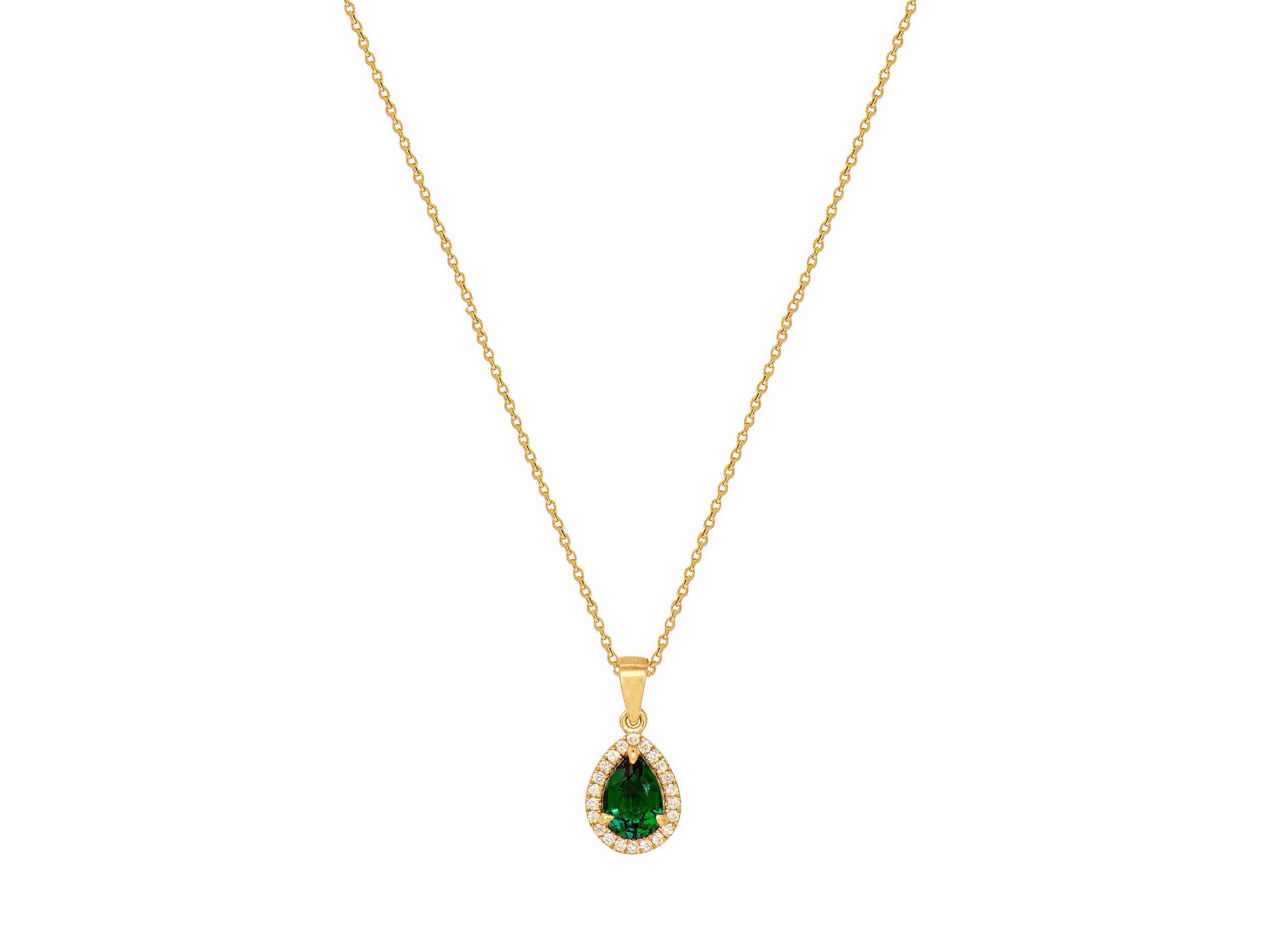 Ροζέτα μενταγιόν με σμαράγδι και διαμάντια, σε χρυσό 18 Καρατίων. Κοσμείται με ένα εντυπωσιακό σμαράγδι σε κοπή pear στο κέντρο και με 22 λαμπερά διαμάντια κοπής round brilliant περιμετρικά. Το συνολικό μήκος του με τον κρίκο είναι 1,50 cm. Συνοδεύεται από χρυσή αλυσίδα 18Κ. Συνδυάστε το με τα σκουλαρίκια και το δαχτυλίδι της ίδιας σειράς και αποκτήστε ένα κομψό και διαχρονικό σετ κοσμημάτων για κάθε περίσταση!
