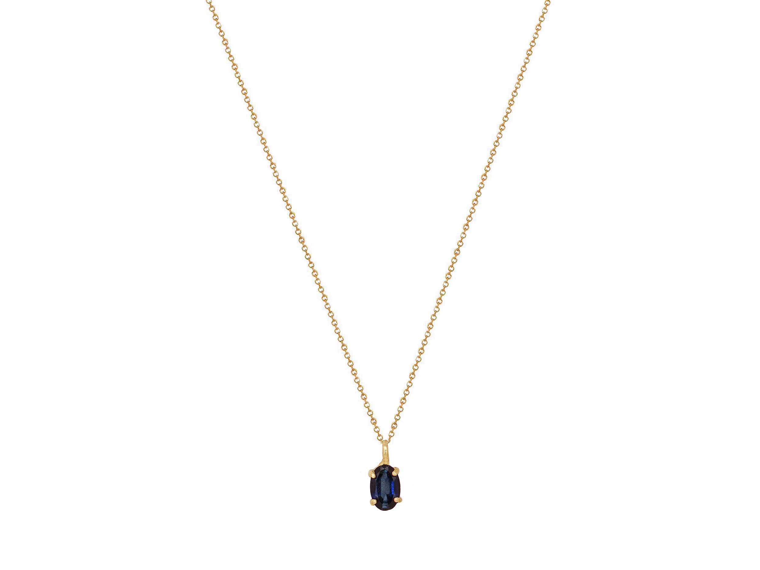 Μονόπετρο μενταγιόν με ζαφείρι οβάλ, σε χρυσό 18 Καρατίων. Συνοδεύεται από χρυσή αλυσίδα 18Κ, μήκους 40,00 cm. Ένα διαχρονικό κόσμημα που θα αναδείξει την κομψότητά σας σε κάθε περίσταση.
