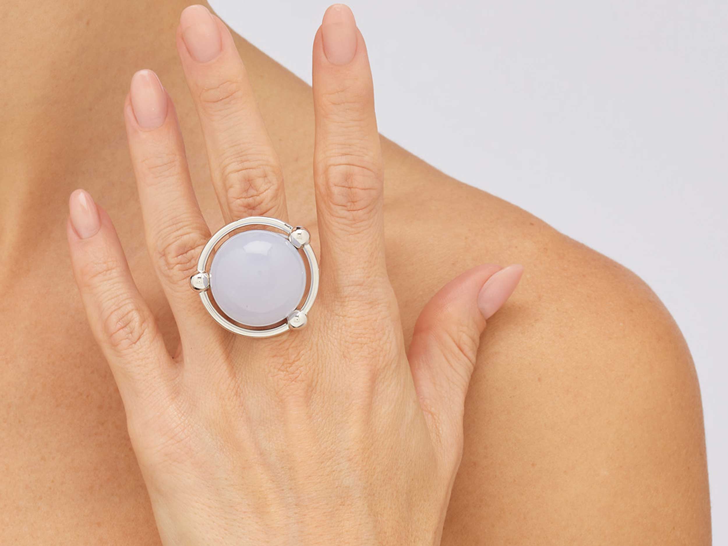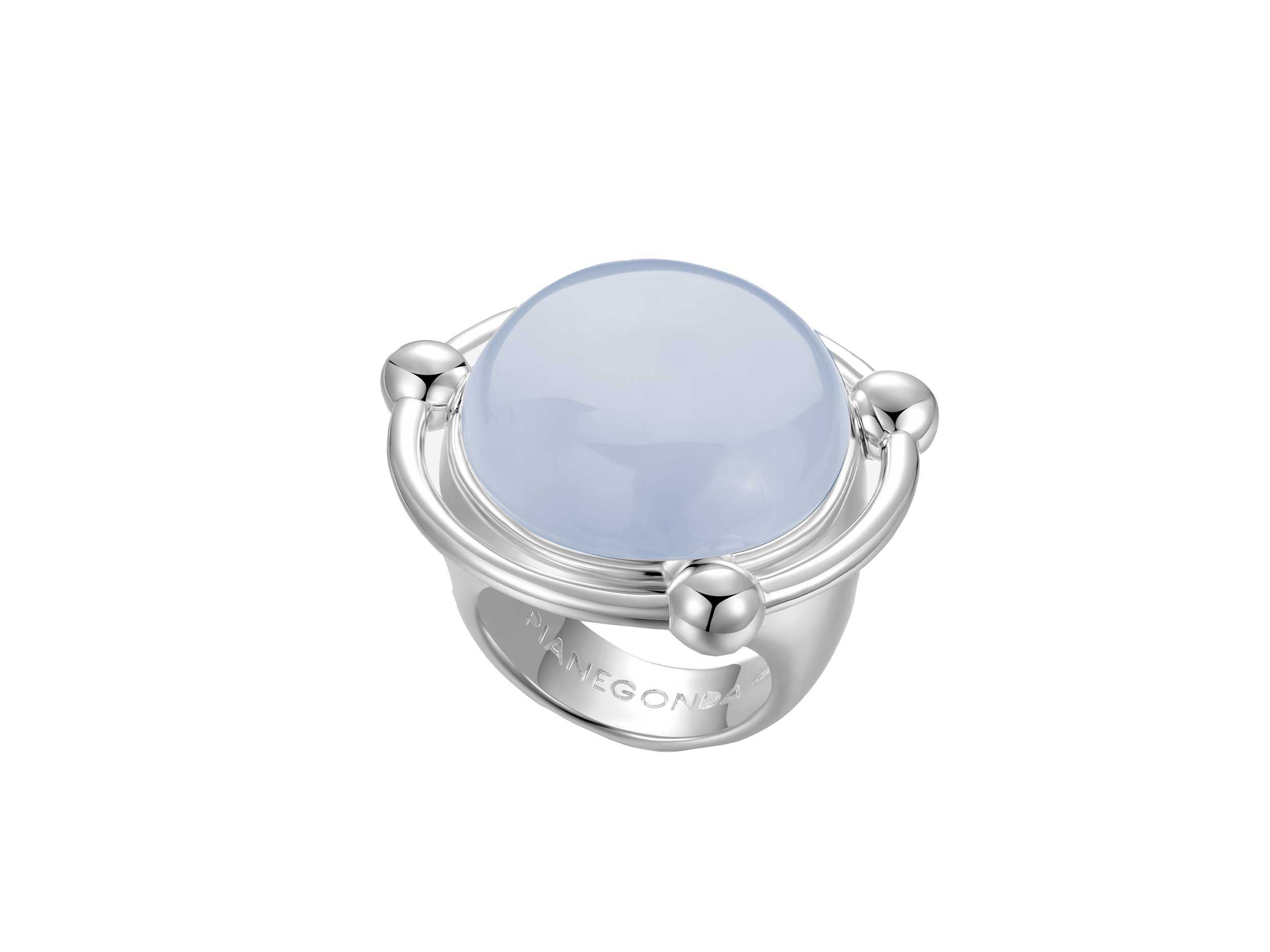Pianegonda δαχτυλίδι με χαλκηδόνιο σε ασήμι 925. Μοναδικό δαχτυλίδι με έναν εντυπωσιακό μπλε χαλκηδόνιο και διακοσμητικές σφαίρες περιμετρικά. Συνδυάζεται υπέροχα με τα σκουλαρίκια και το κολιέ της ίδιας σειράς.