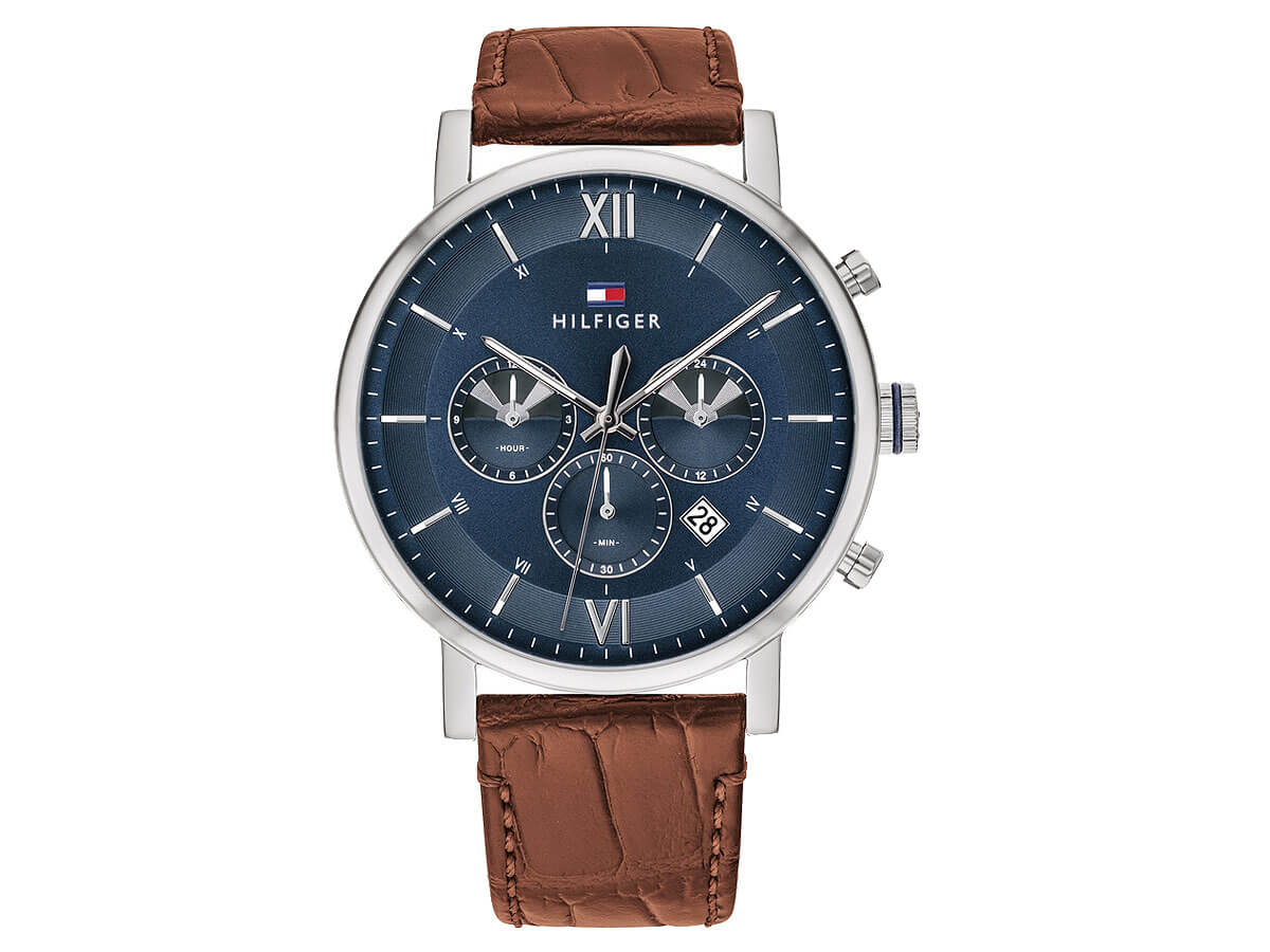 Ρολόι ανδρικό Tommy Hilfiger της σειράς Evan (1710393), με καφέ δερμάτινο λουράκι και κάσα από ανοξείδωτο ατσάλι. Διαθέτει μπλε καντράν, λατινικούς αριθμούς και χρονογράφο ακριβείας, με ενδείξεις ώρας και ημερομηνίας. Κομψό ρολόι με άψογη σχεδίαση, ιδανικό για τις καθημερινές σας εμφανίσεις.