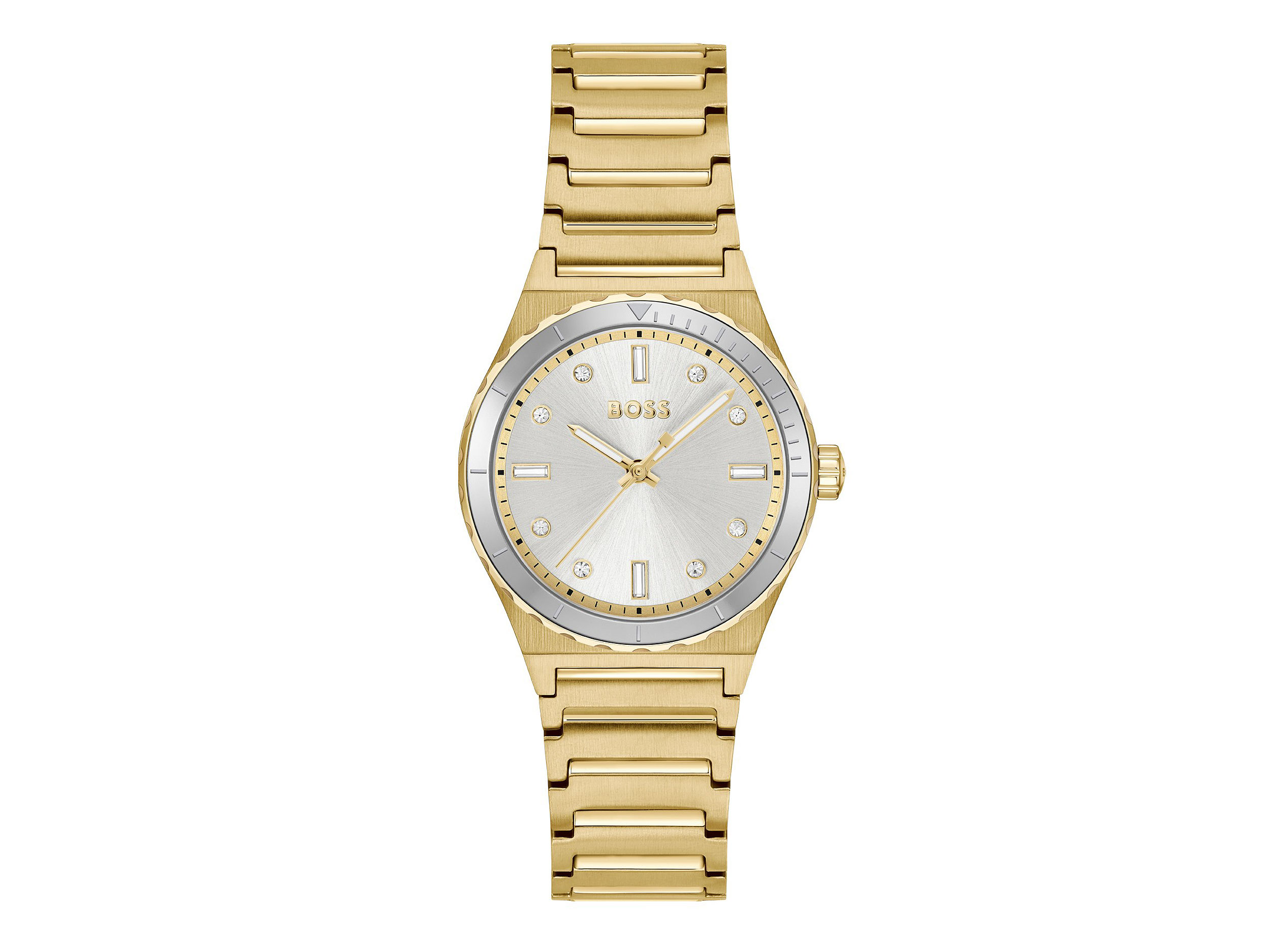 Γυναικείο επίχρυσο ρολόι Boss Candor Sport (1502789). Εντυπωσιακό ρολόι με δίχρωμο πλαίσιο και μπρασελέ από επιχρυσωμένο ανοξείδωτο ατσάλι. Έχει υπέροχο ασημί καντράν και κοσμείται με λευκές πέτρες.