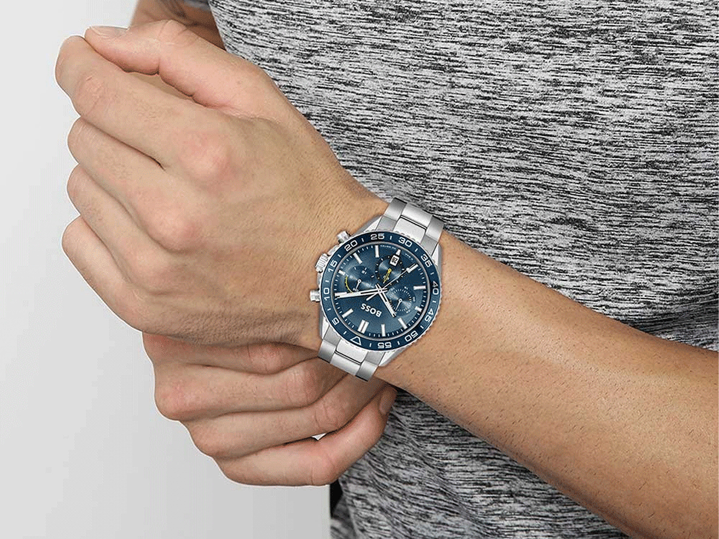 Ανδρικό Ρολόι Boss Runner Chronograph (κωδ: 1514143). Κοσμείται με εντυπωσιακό μπλε καντράν και μπρασελέ από ανοξείδωτο ατσάλι. Το ρολόι διαθέτει λειτουργία χρονογράφου και ένδειξη ημερομηνίας.