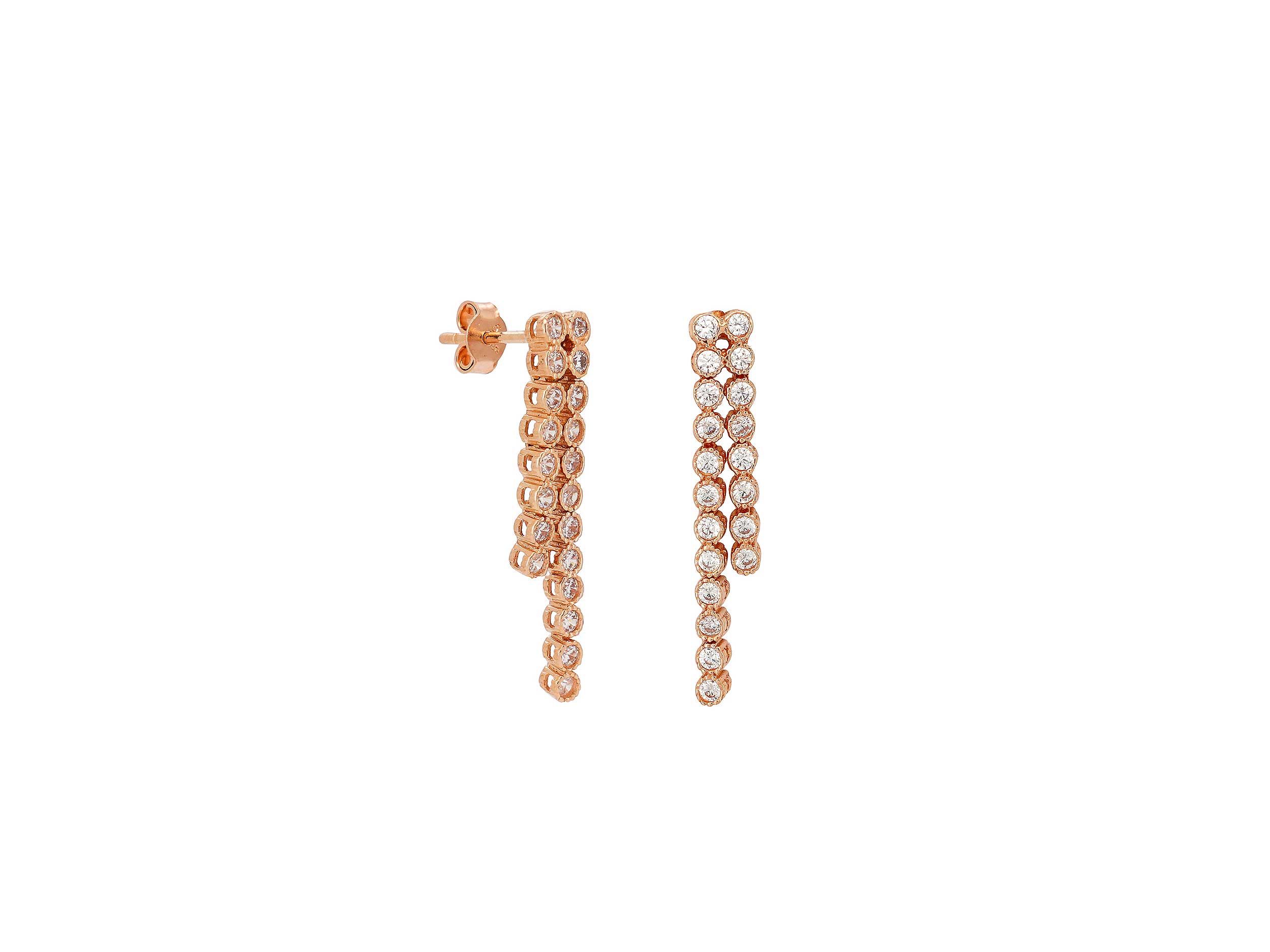 Κομψά ροζ χρυσά σκουλαρίκια κρεμαστά 14 Καρατίων, με άψογη σχεδίαση και λουστρέ φινίρισμα. Ένα υπέροχο ζευγάρι σκουλαρίκια, με λαμπερές cubic ζιργκόν πέτρες σε λευκό χρώμα, για εμφανίσεις που ξεχωρίζουν!