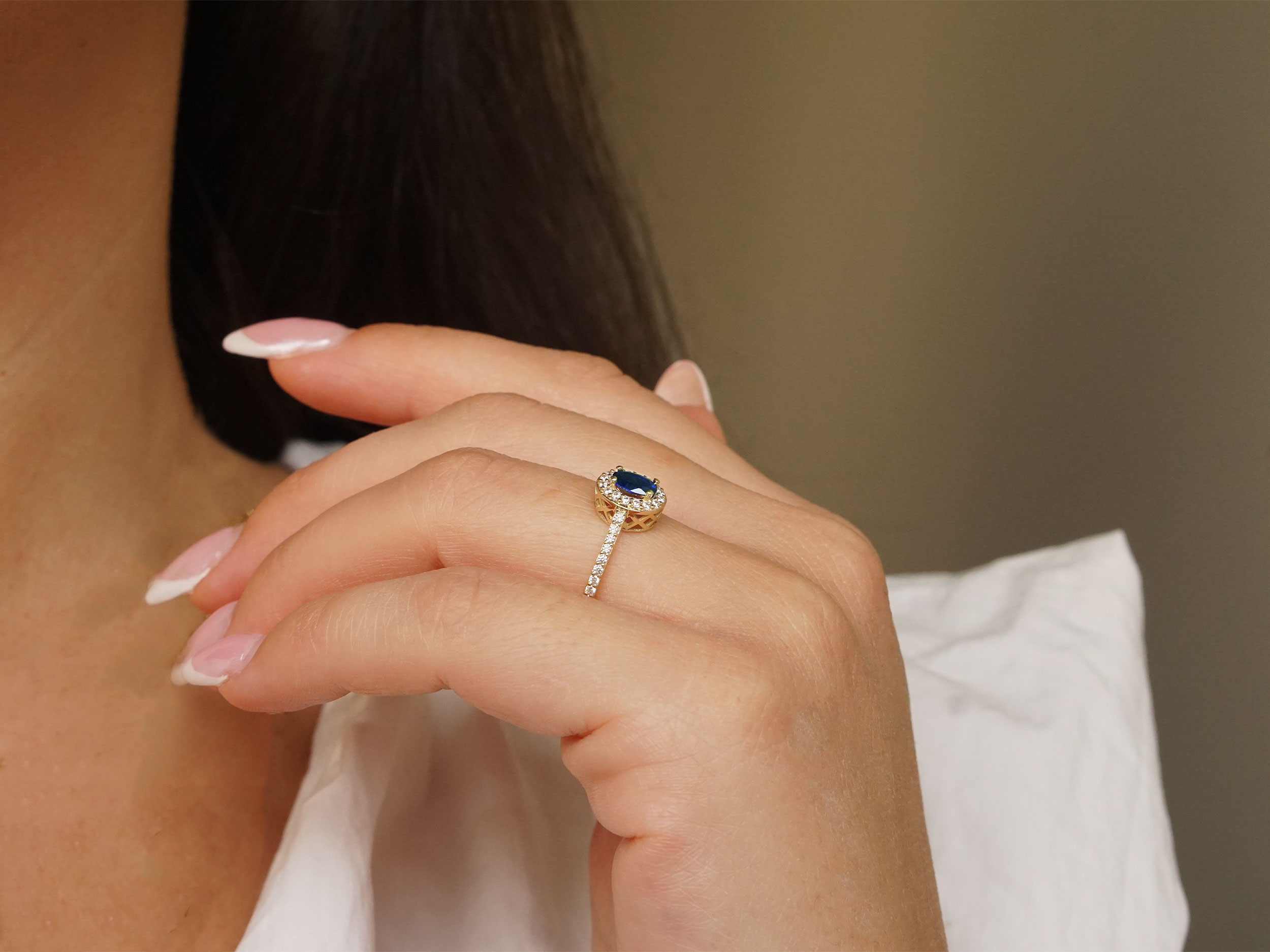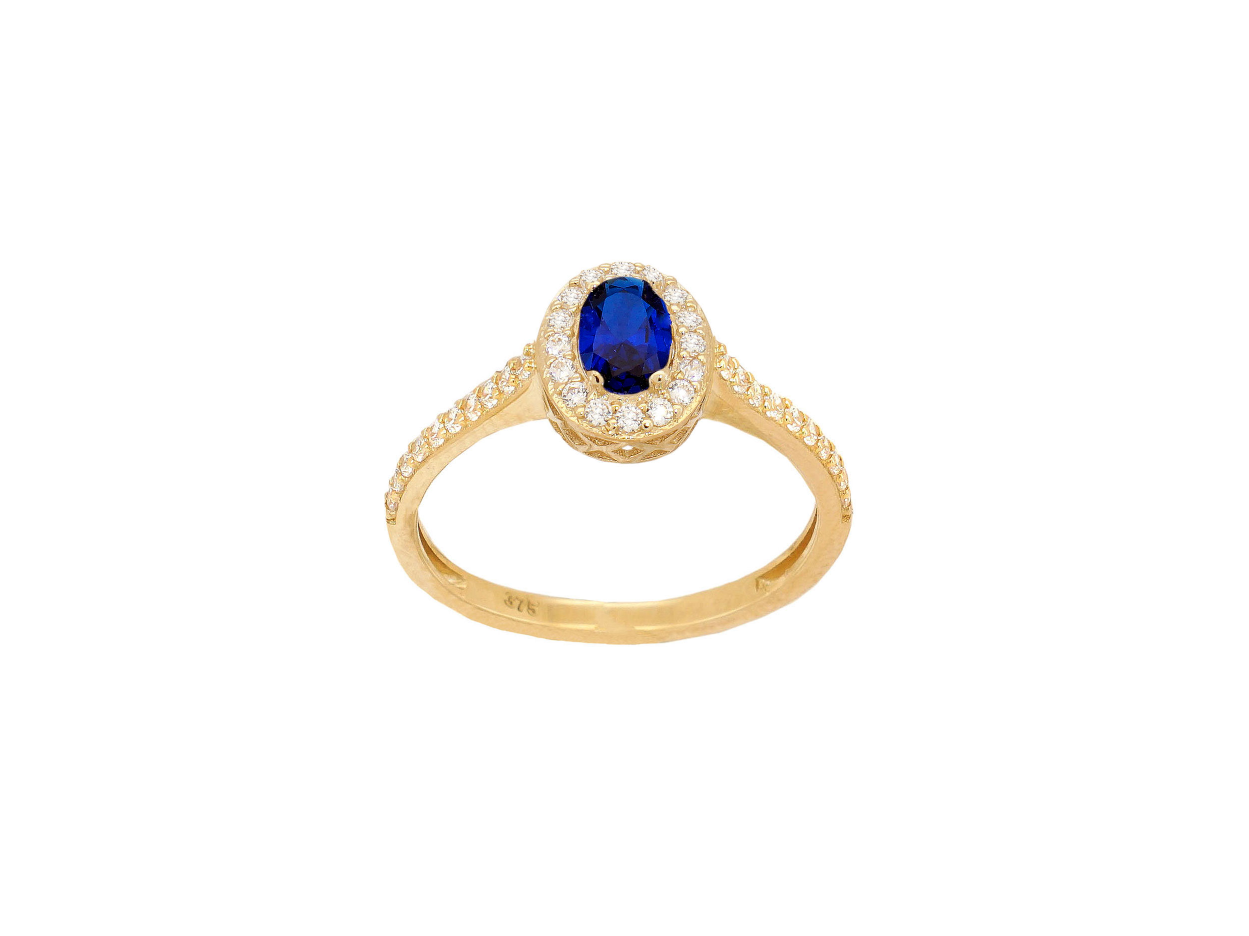Ροζέτα δαχτυλίδι με μπλε πέτρα, σε χρυσό 9 Καρατίων. Ένα κομψό και διαχρονικό δαχτυλίδι, διακοσμημένο με μια οβάλ cubic ζιργκόν πέτρα σε μπλε χρώμα, που μαγνητίζει τα βλέμματα. Περιμετρικά της πέτρας και στη γάμπα υπάρχουν λευκές cubic ζιργκόν πέτρες.