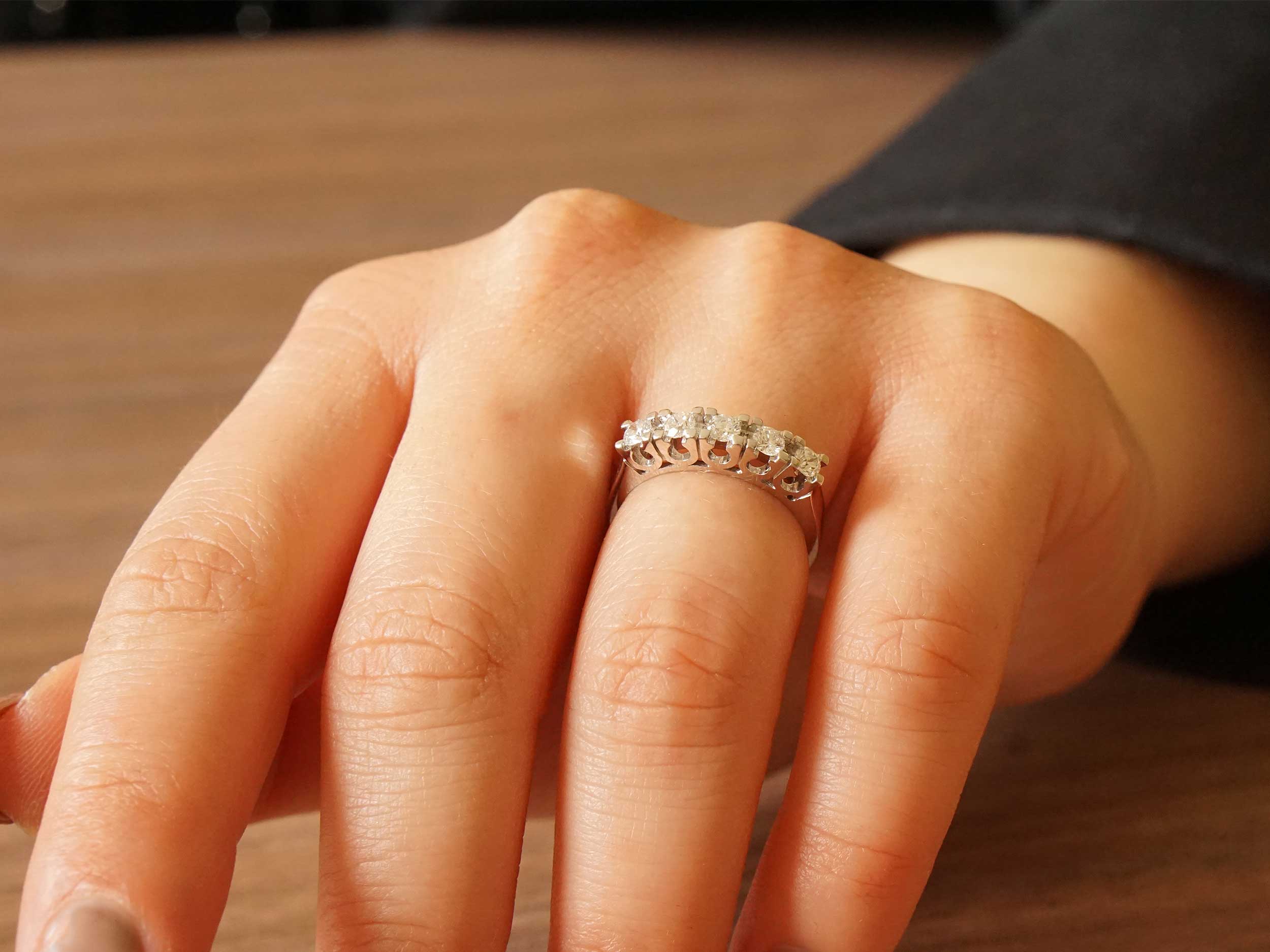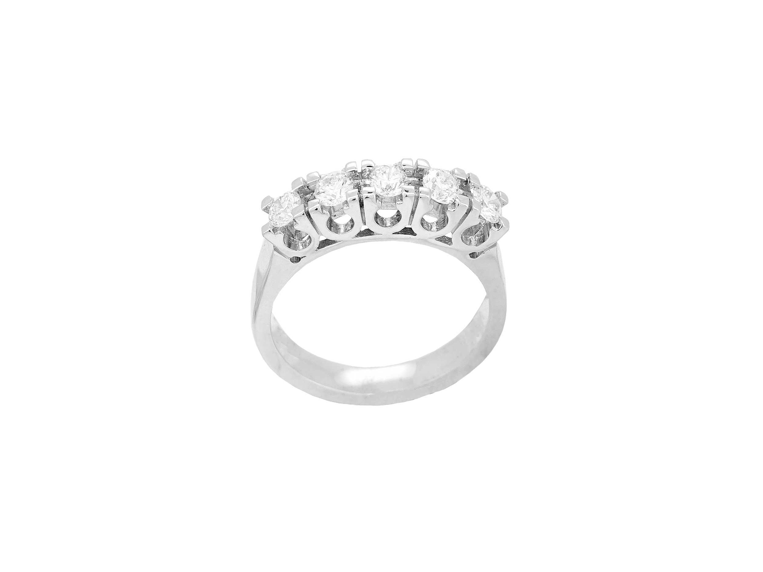 Σειρέ δαχτυλίδι με μπριγιάν, σε λευκόχρυσο 18 Καρατίων, με λουστρέ φινίρισμα. Ένα εντυπωσιακό δαχτυλίδι, με διαχρονική σχεδίαση, διακοσμημένο με πέντε εκθαμβωτικά διαμάντια κοπής round brilliant, που θα λατρέψετε.
