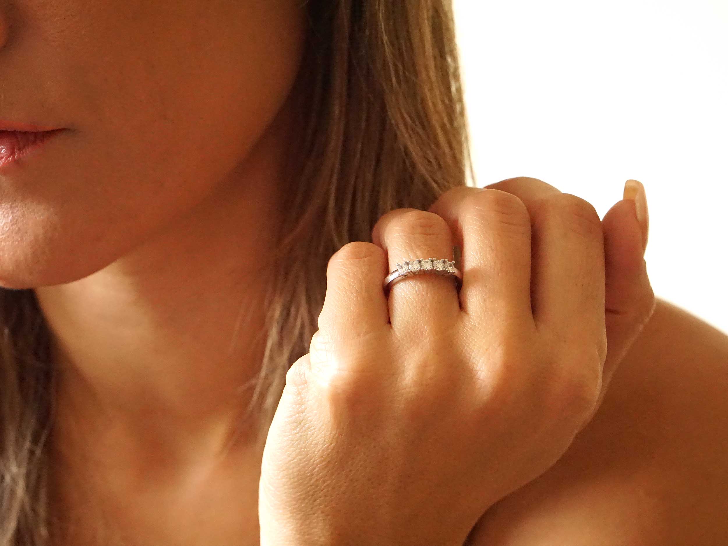 Σειρέ δαχτυλίδι με διαμάντια, σε λευκόχρυσο 18 Καρατίων, με λουστρέ φινίρισμα. Κοσμείται με πέντε εκθαμβωτικά διαμάντια κοπής round brilliant. Ένα κλασικό κόσμημα που επιλέγεται διαχρονικά για δώρο επετείου.