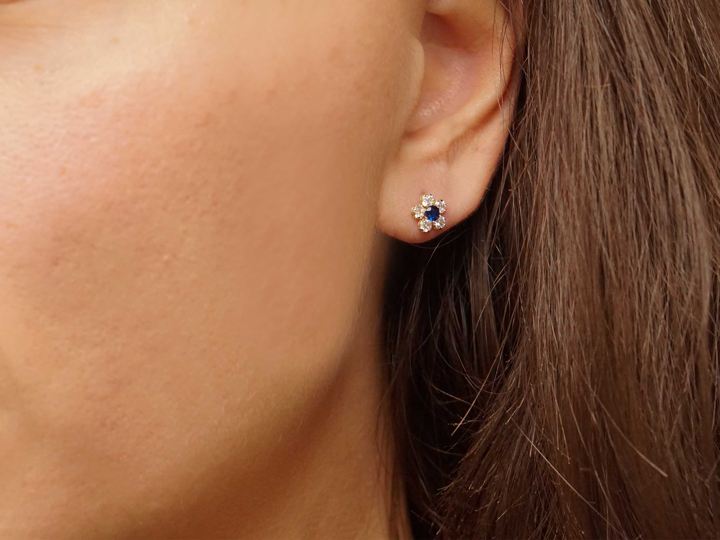 Χρυσά σκουλαρίκια λουλούδια καρφωτά 14 Καρατίων. Κομψά σκουλαρίκια σε σχήμα λουλουδιού, διακοσμημένα με λευκές cubic ζιργκόν πέτρες και μια μπλε cubic ζιργκόν πέτρα στο κέντρο. Ιδανικά για τις καθημερινές σας εμφανίσεις.