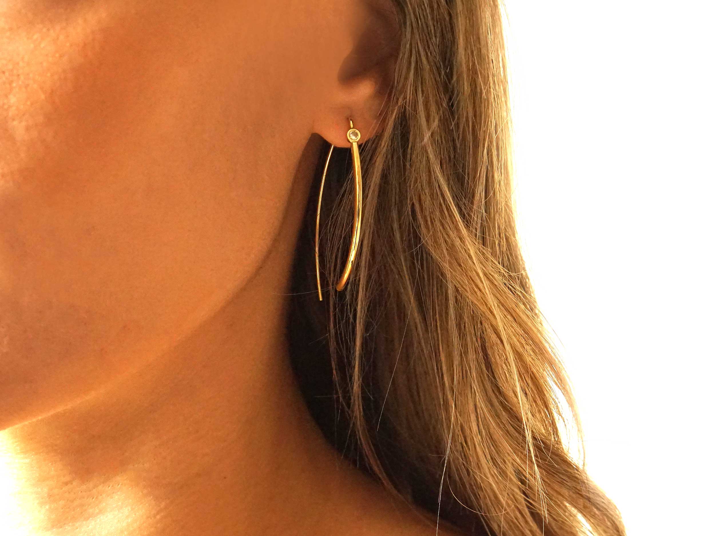 Μοντέρνα σκουλαρίκια κρεμαστά σε χρυσό 14 Καρατίων, με λουστρέ φινίρισμα. Το πλάτος τους είναι 3 mm και κοσμούνται με λευκές cubic ζιργκόν πέτρες. Ξεχωρίζουν για τον μοντέρνο και αέρινο σχεδιασμό τους, αποπνέοντας κομψότητα και μινιμαλιστική φινέτσα.