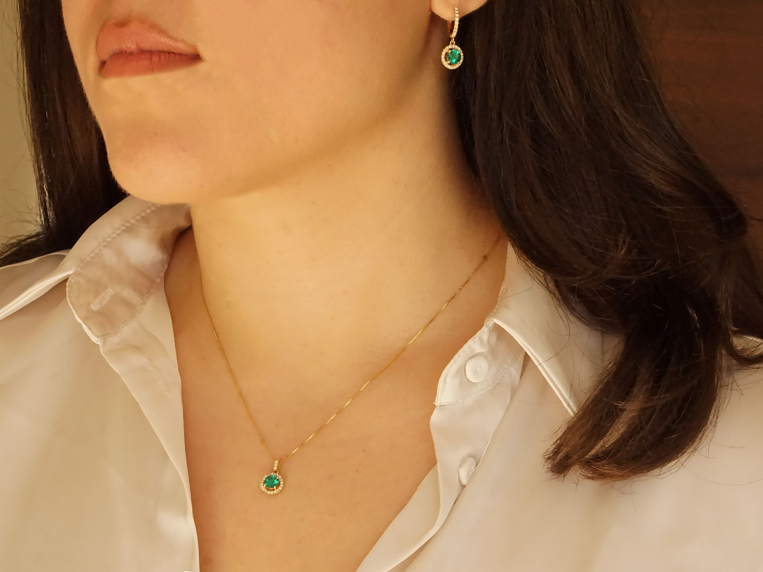 Σκουλαρίκια κρικάκια με κρεμαστό μοτίφ, σε χρυσό 18 Καράτια. Εντυπωσιακά σκουλαρίκια με κρικάκια 12 mm, διακοσμημένα το καθένα με 29 διαμάντια κοπής round brilliant και με έναν υπέροχο πράσινο γρανάτη στο κέντρο σε ροζέτα. Φορέστε τα με το αντίστοιχο μενταγιόν και μαγνητίστε τα βλέμματα.