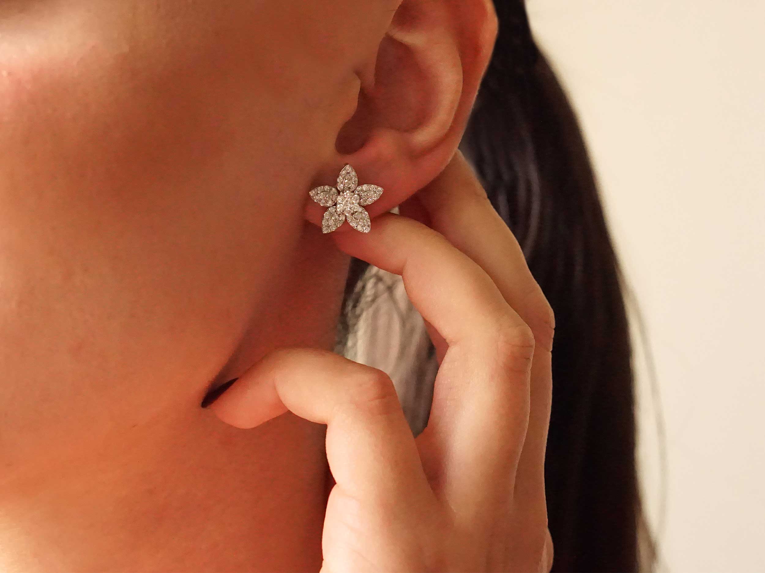 Λαμπερά σκουλαρίκια λουλούδια, σε λευκόχρυσο 18 Καράτια. Κάθε σκουλαρίκι είναι διακοσμημένο με λαμπερά διαμάντια κοπής round brilliant. Το κούμπωμα τους είναι καρφωτό. Κόσμημα που θα σας κάνει να ακτινοβολείται!