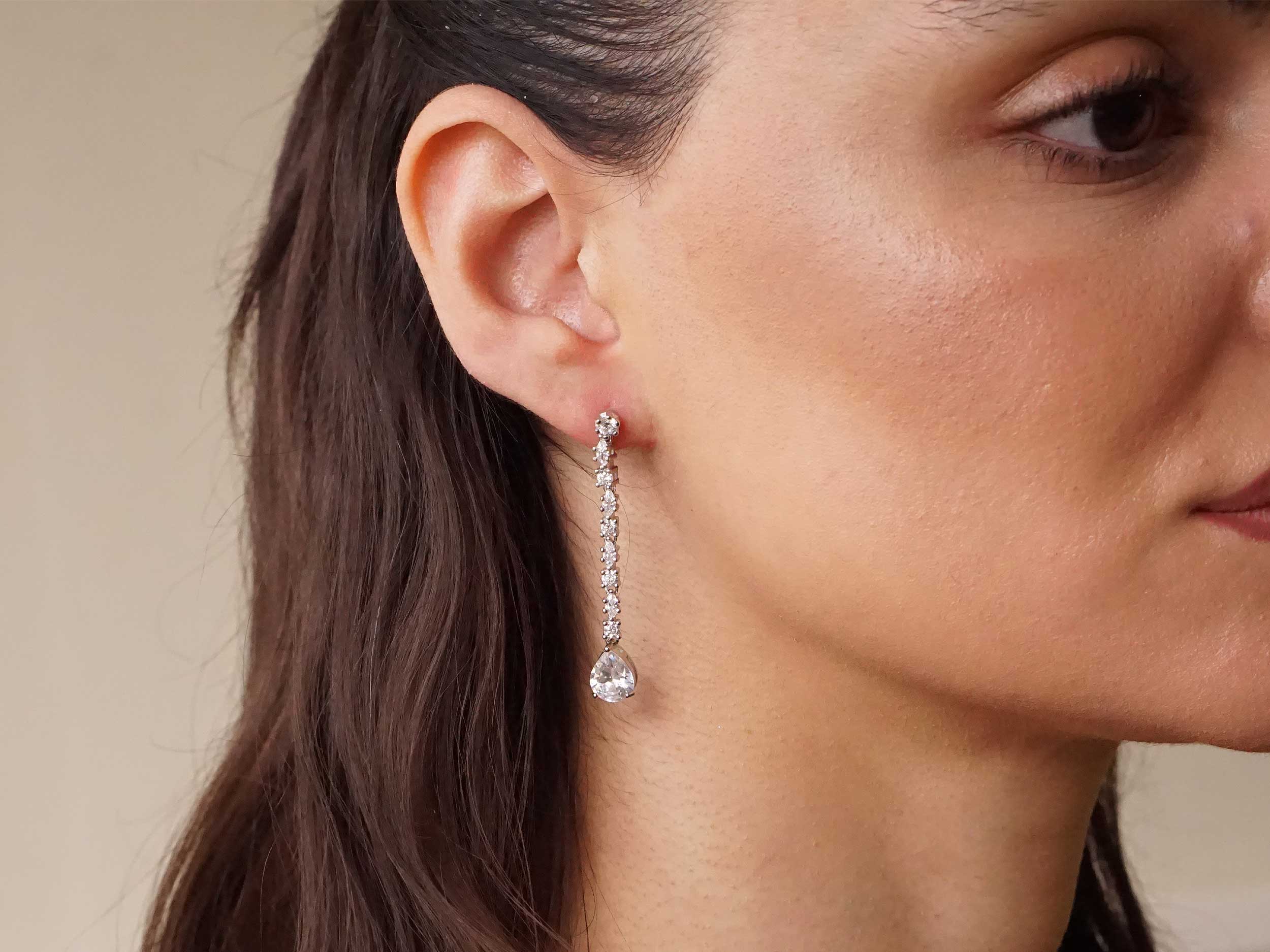 Glam, σκουλαρίκια με δάκρυ, από ασήμι 925. Το μέταλλο είναι λευκού χρώματος και διαθέτει λουστρέ φινίρισμα. Τα σκουλαρίκια είναι διακοσμημένα με μια σειρά από 9 μικρότερες ζιργκόν πέτρες η οποία καταλήγει σε ένα μεγαλύτερου σχήματος δάκρυ. Ιδανικά για να φορεθούν στις βραδινές και επίσημες εμφανίσεις σας!