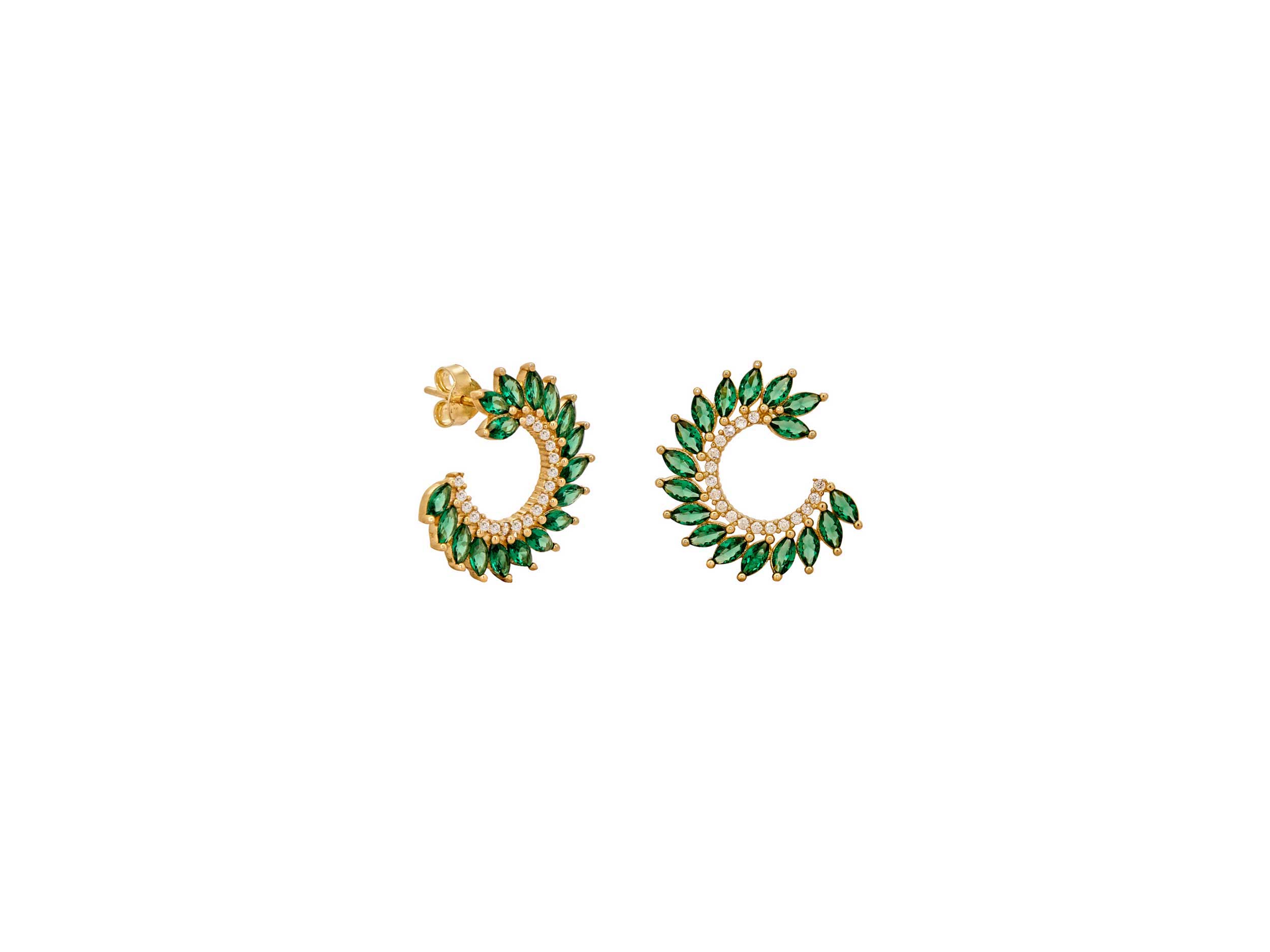 Καρφωτά σκουλαρίκια με πράσινες πέτρες, σε χρυσό 14 Καρατίων. Κομψά και λαμπερά σκουλαρίκια, διακοσμημένα με πράσινες ζιργκόν πέτρες σε σχήμα marquise και με λευκές cubic ζιργκόν πέτρες. Ολοκληρώστε μια εντυπωσιακή εμφάνιση συνδυάζοντας τα σκουλαρίκια με το αντίστοιχο μενταγιόν.