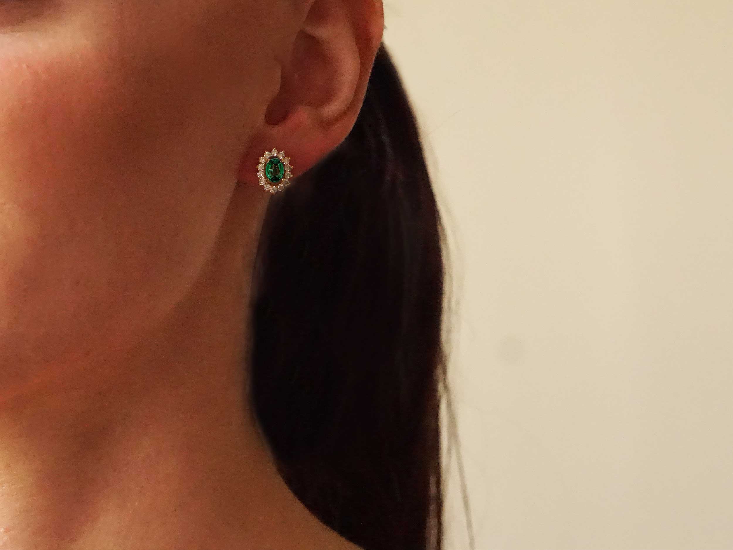Χρυσά σκουλαρίκια ροζέτες καρφωτά 18 Καρατίων. Με κεντρικό πράσινο εντυπωσιακό σμαράγδι και περιμετρικά διαμάντια brillant 14 σε αριθμό στο κάθε σκουλαρίκι. Διαχρονικό κόσμημα για κάθε γυναίκα!
