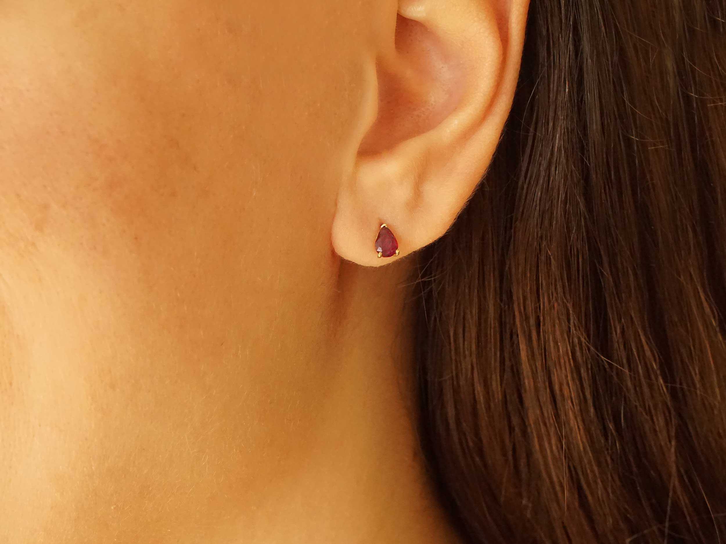 Καρφωτά σκουλαρίκια με ρουμπίνι, σε χρυσό 18 Καρατίων. Ένα κομψό ζευγάρι σκουλαρίκια δάκρυ με διαχρονική σχεδίαση και υπέροχο χρώμα, ιδανικά για κάθε περίσταση.