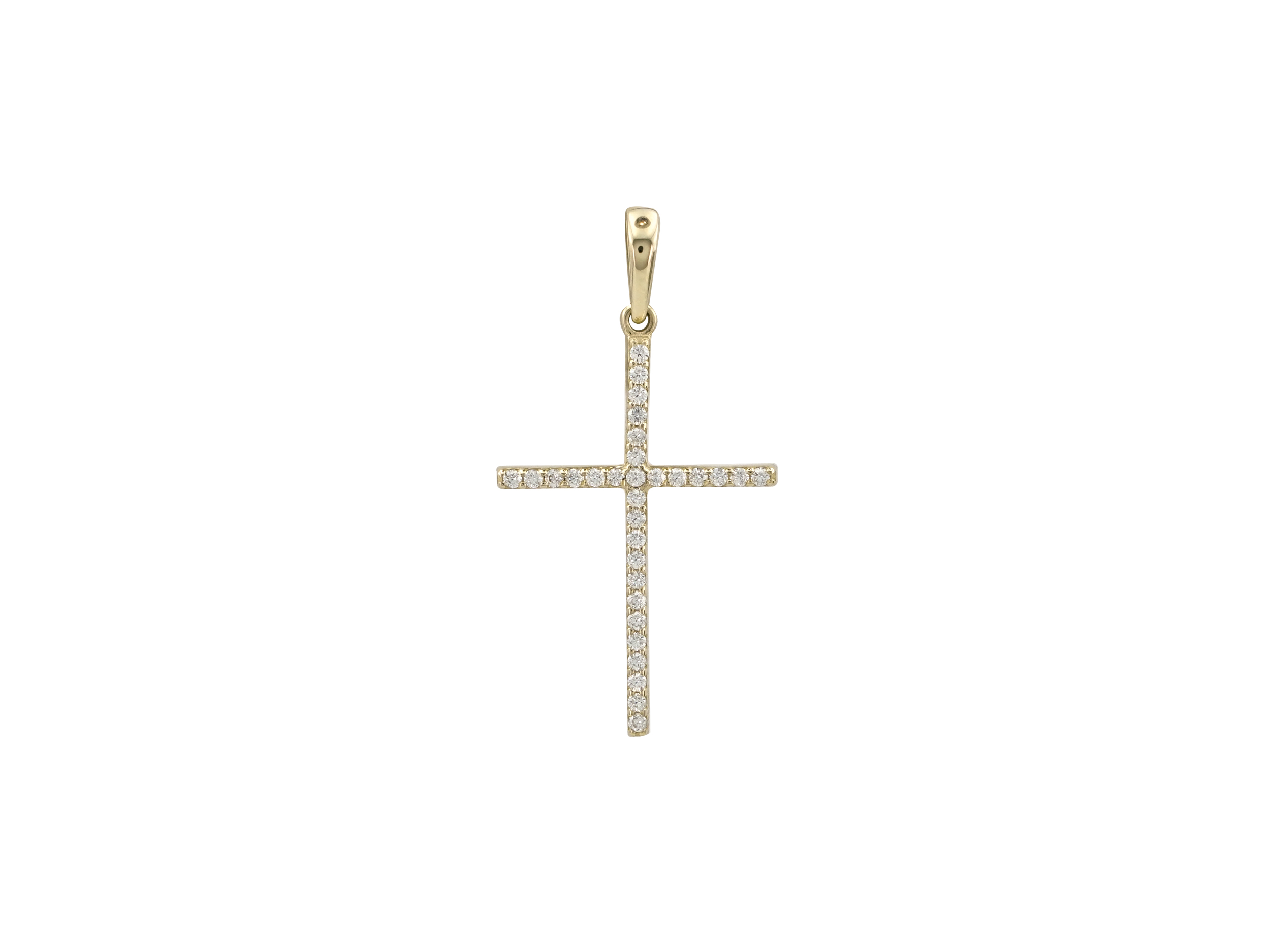 Σταυρός 14 Καράτια σε χρυσό με λουστρέ φινίρισμα. Το χρώμα του μετάλλου του είναι κίτρινο χρυσό και το συνολικό μήκος του με τον κρίκο είναι 3,50 cm. Η μπροστινή επιφάνειά του κοσμείται με λευκές cubic ζιργκόν πέτρες που του δίνει μία ιδιαίτερη λάμψη. Συνδυάστε τον μοναδικά με τις χρυσές αλυσίδες της συλλογής μας.