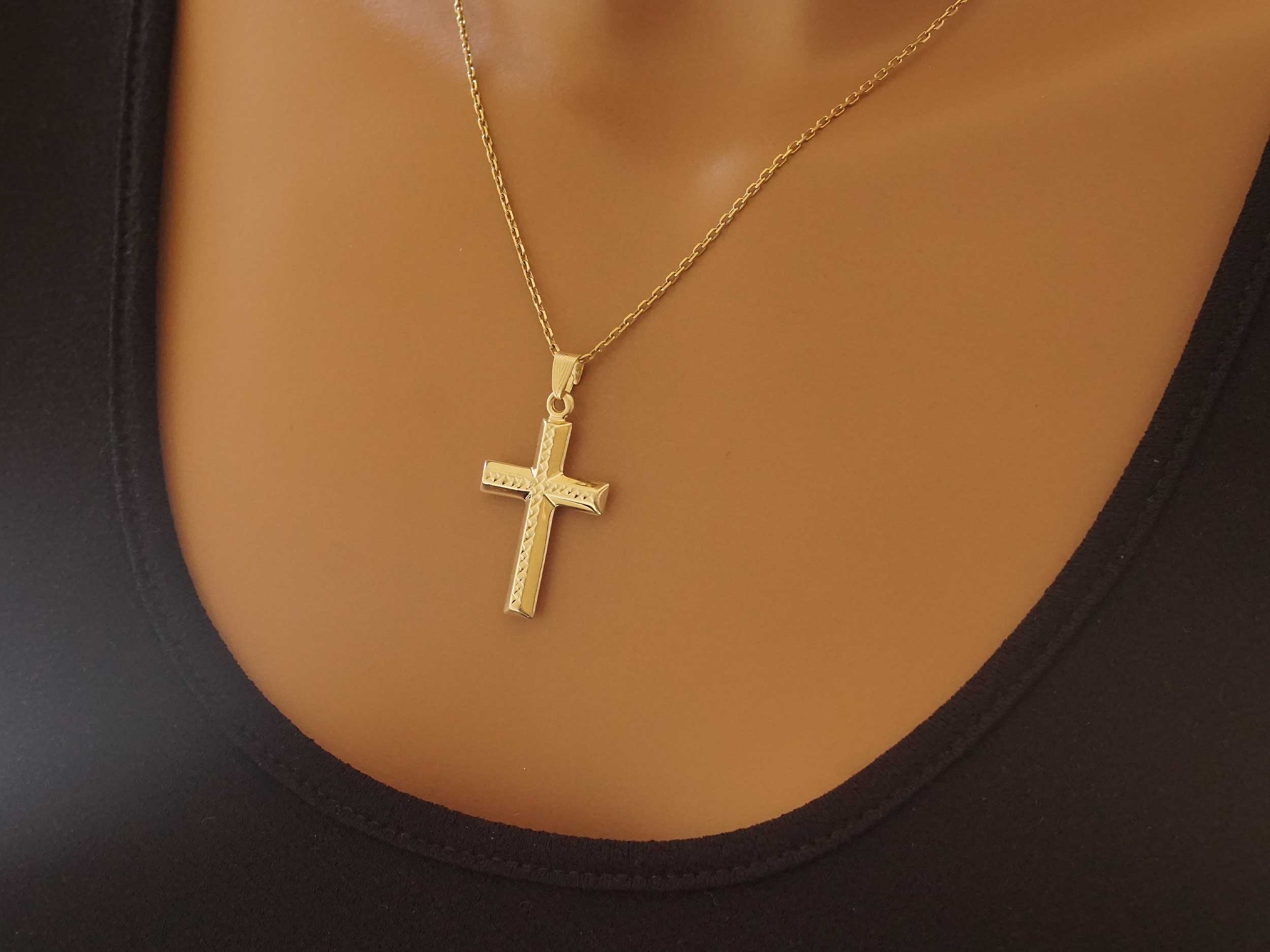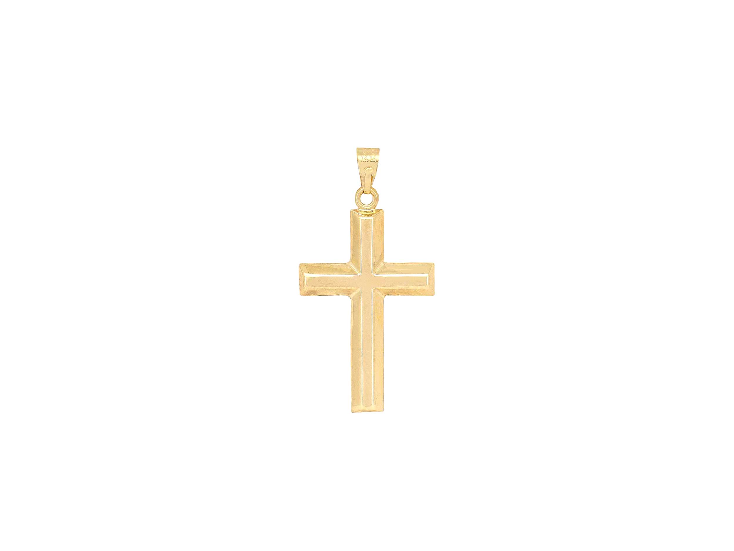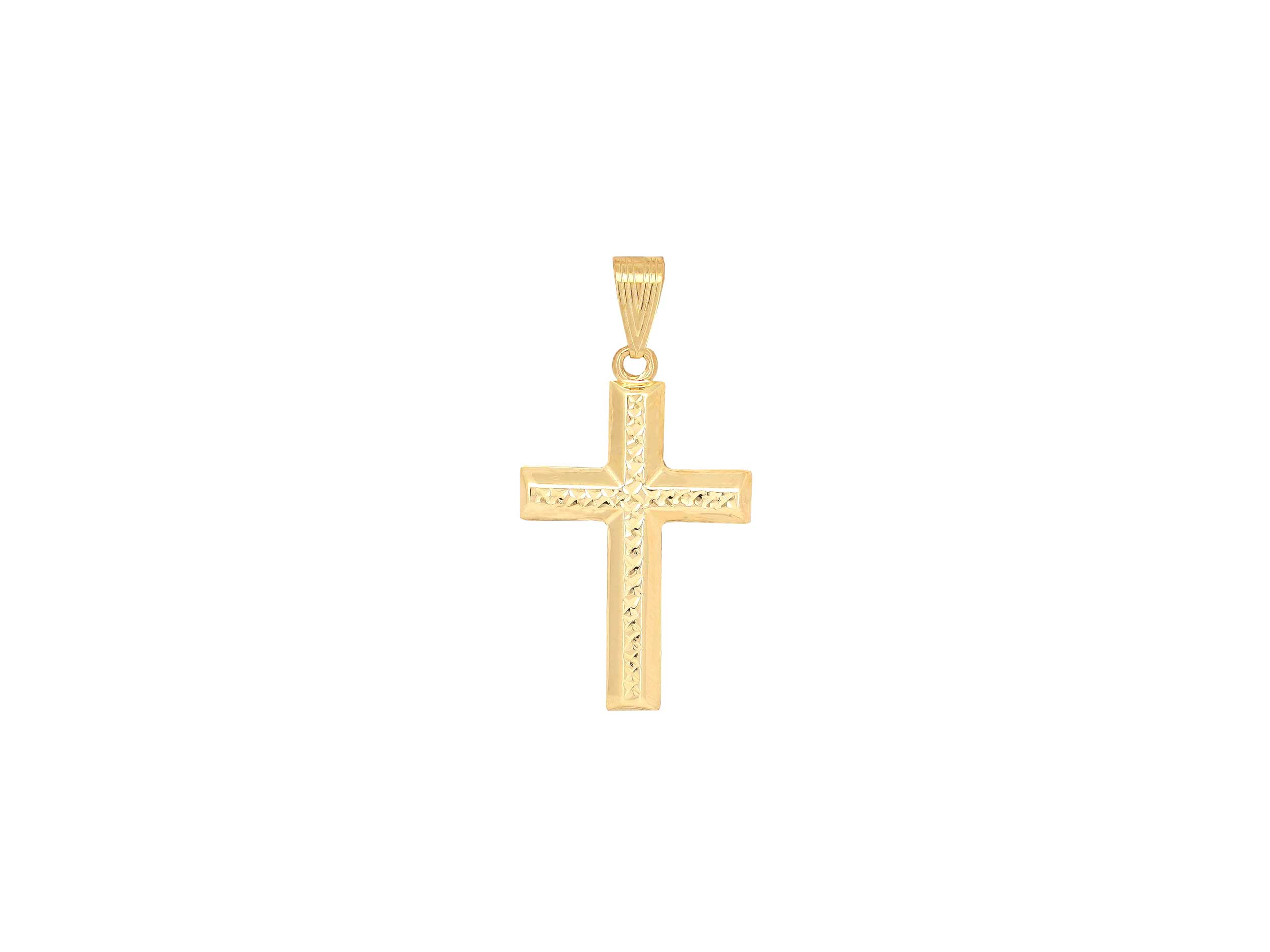 Σταυρός χρυσός 9Καρατίων, με λουστρέ φινίρισμα και λαμπερό διαμαντάρισμα που αντανακλά το φως. Το συνολικό μήκος του με τον κρίκο είναι 3,10 cm. Συνδυάστε τον σταυρό με μια χρυσή αλυσίδα.