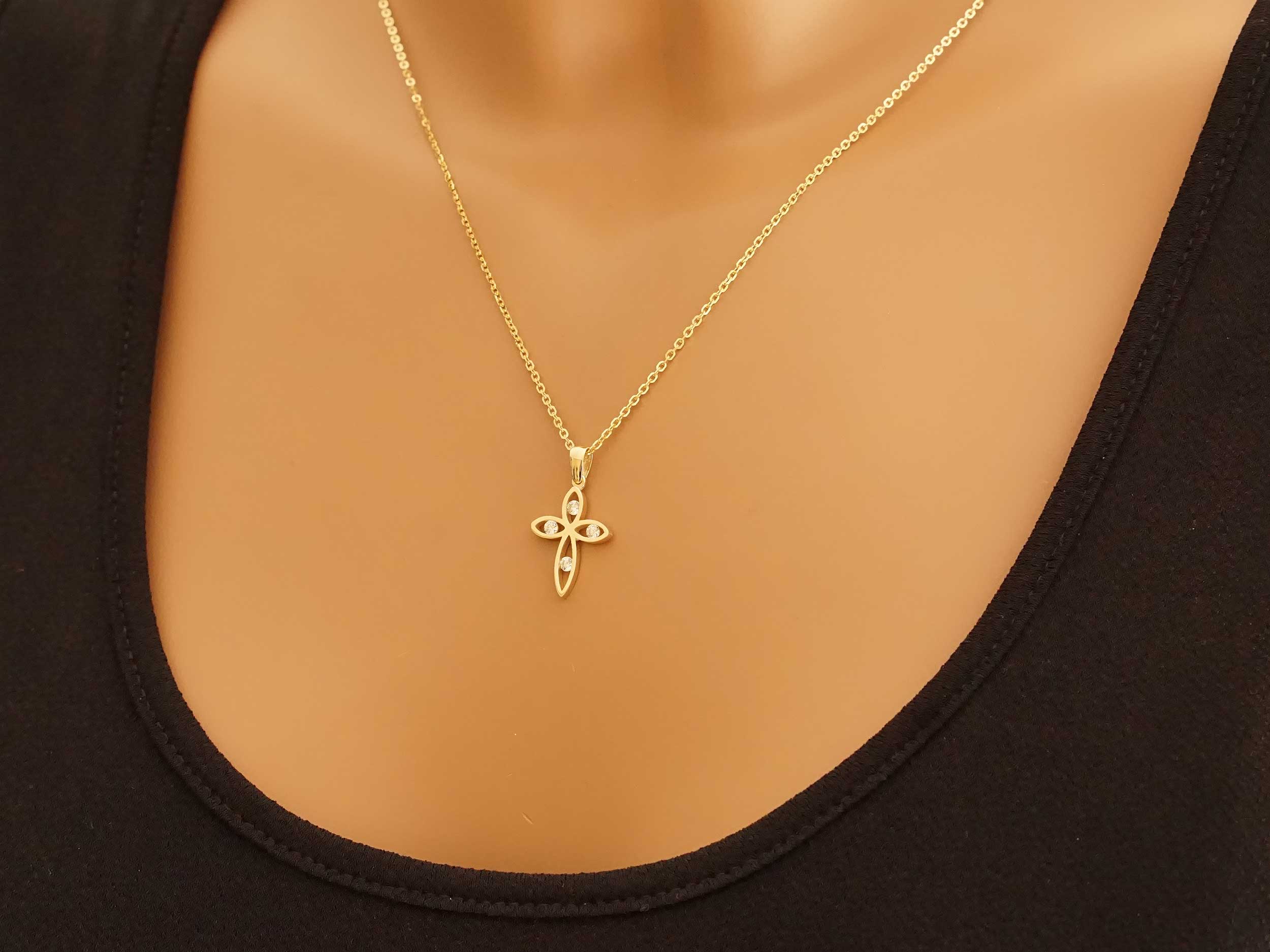 Σταυρός γυναικείος χρυσός 14 Καρατίων. Ένας κομψός διάτρητος χρυσός σταυρός, με λουστρέ φινίρισμα, διακοσμημένος με τέσσερις λευκές cubic ζιργκόν πέτρες. Το συνολικό μήκος του είναι 2,40 cm. Μπορεί να φορεθεί με μια χρυσή αλυσίδα 14Κ.