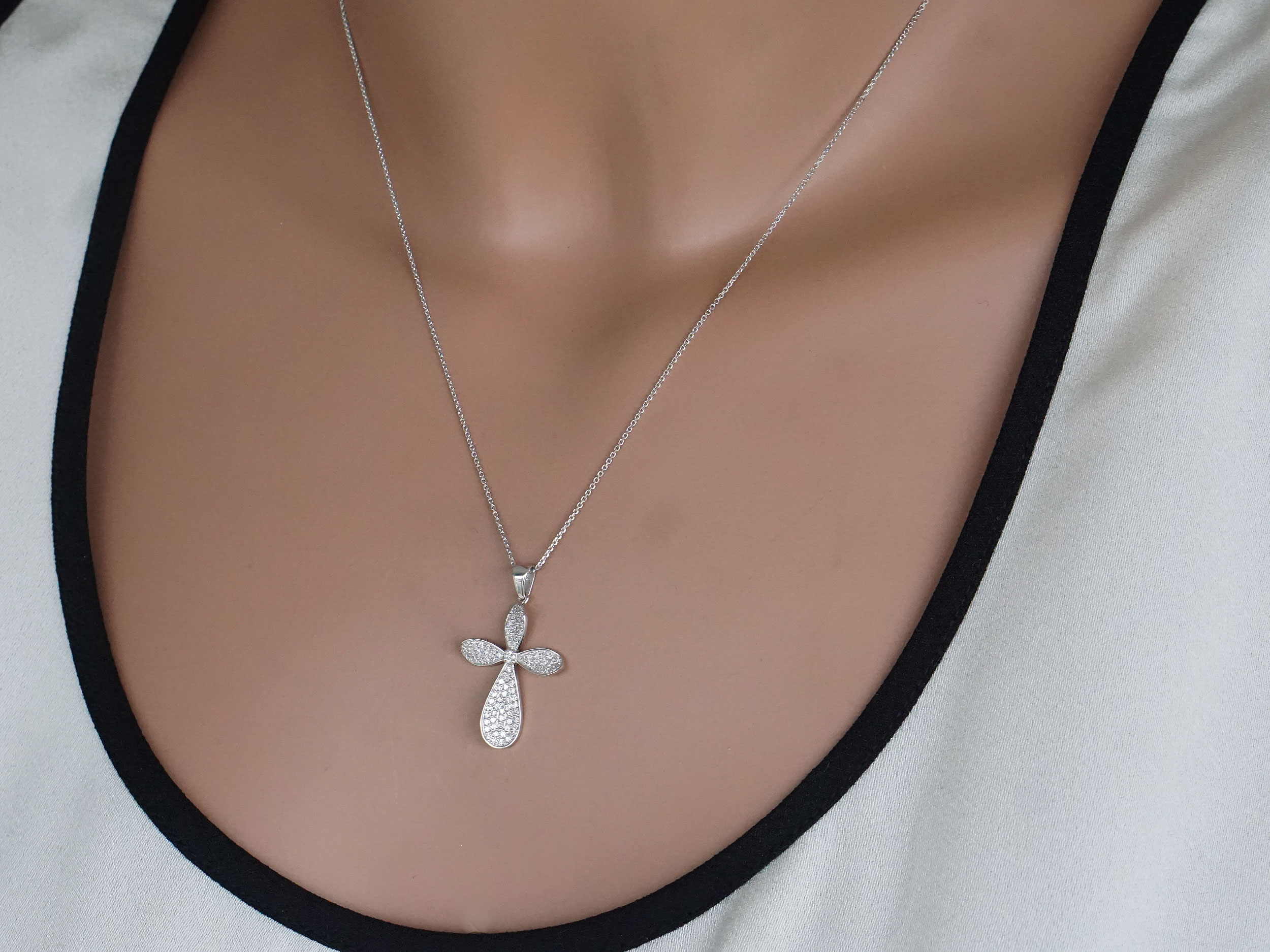 Σταυρός γυναικείος με διαμάντια και αλυσίδα 18Κ. Έχει λουστρέ φινίρισμα, λευκόχρυσο χρώμα μετάλλου και κοσμείται από διαμάντια κοπής brilliant σε ολόκληρη την επιφάνειά του! Το συνολικό μήκος του με τον κρίκο είναι 2,90 cm. Συνοδεύεται από αλυσίδα μήκους 45cm. Είναι ένα μοναδικό και διαχρονικό κόσμημα που θα σας συνοδεύει σε κάθε επίσημη περίσταση!