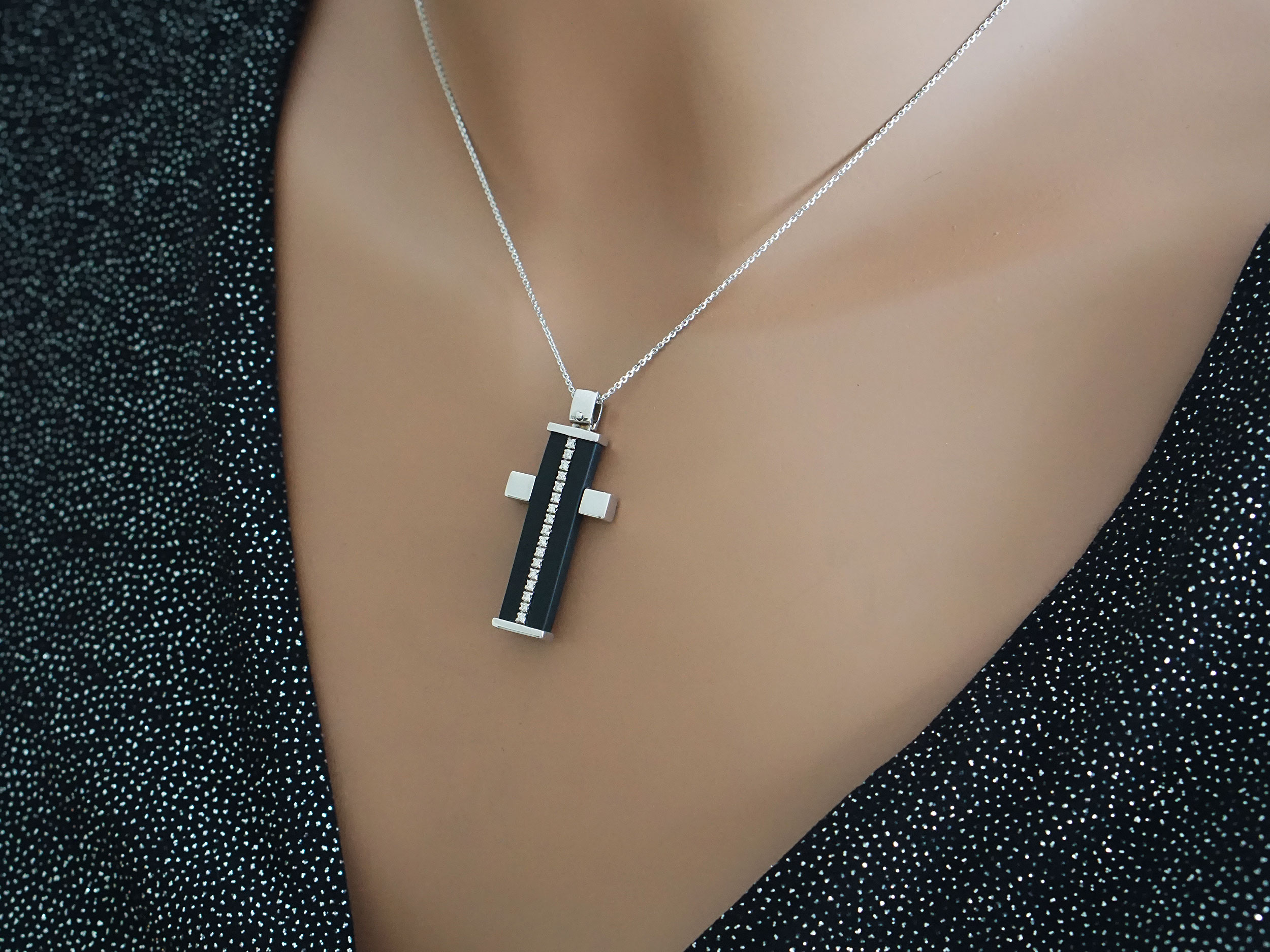Σταυρός λευκόχρυσος με διαμάντια και καουτσούκ. Είναι κατασκευασμένος από λευκόχρυσο 18 καρατίων, με λουστρέ φινίρισμα και συνοδεύεται από αλυσίδα μήκους 40 cm. Το συνολικό μήκος του με τον κρίκο είναι 3,50 cm. Τα 19 λαμπερά διαμάντια κοπής brilliant και η πινελιά με το καουτσούκ δημιουργούν ένα ιδιαίτερο κόσμημα! Αποστέλλεται με το πιστοποιητικό γνησιότητας των διαμαντιών και του μετάλλου.