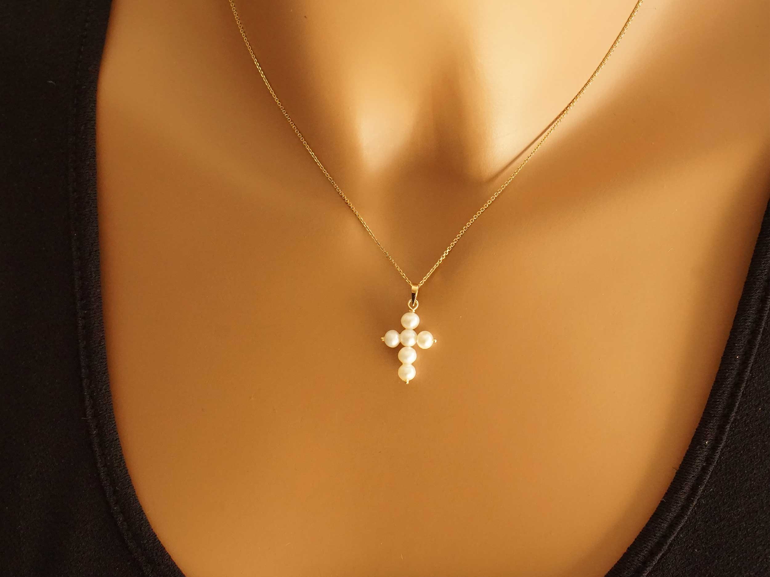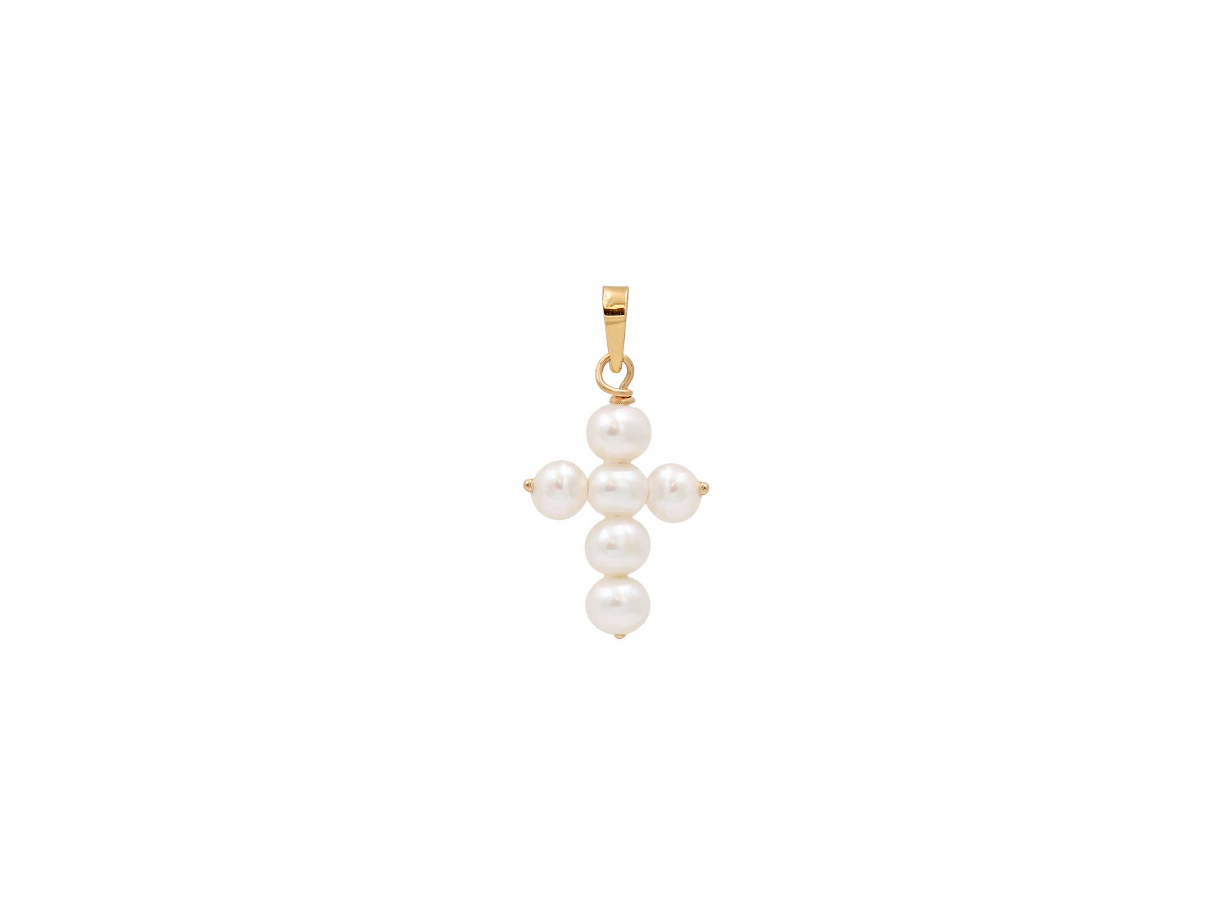 Σταυρός με μαργαριτάρια σε χρυσό 14 Καρατίων, με λαμπερό λουστρέ φινίρισμα. Οι πέρλες είναι fresh water, round σχήματος και η διάμετρος τους 3,5 mm. Το συνολικό του μήκος είναι 2,40 cm. Ένα ιδιαίτερο κομψό κόσμημα που θα λατρεύετε να φοράτε! Συνδυάστε το ιδανικά με μια χρυσή αλυσίδα 14Κ.