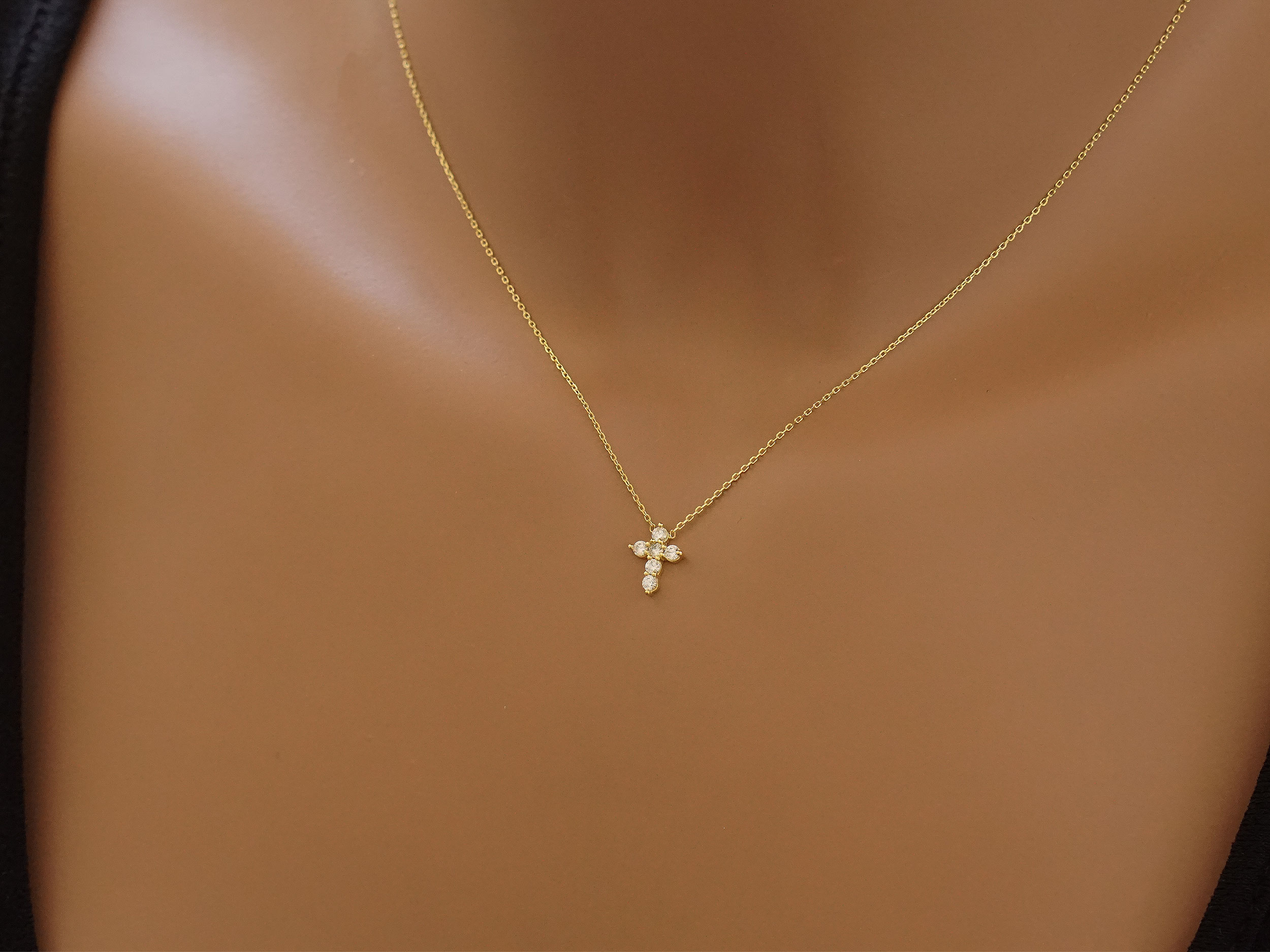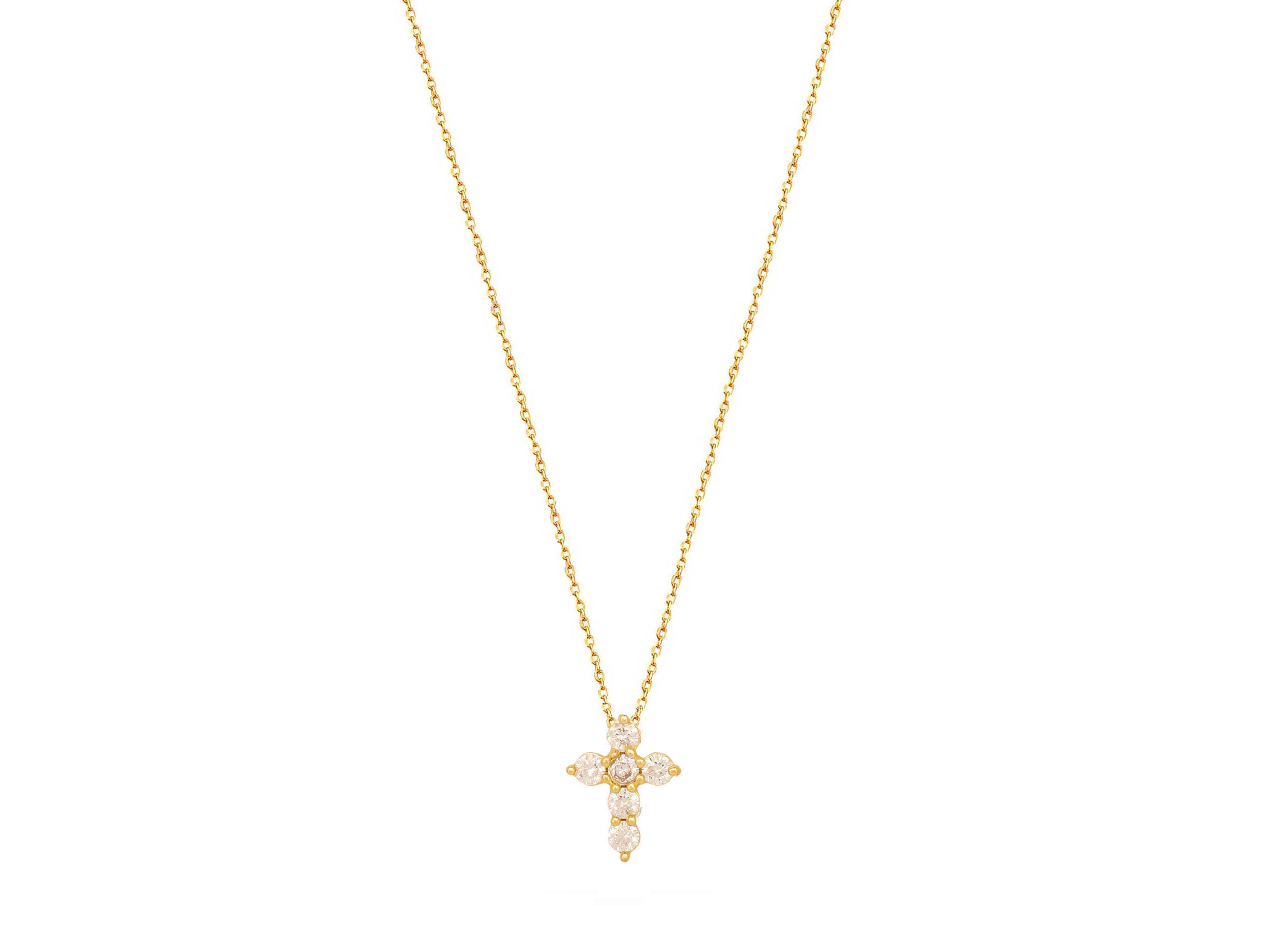 Σταυρουδάκι χρυσό 9Κ με λουστρέ φινίρισμα. Κοσμείται με έξι λευκές cubic ζιργκόν πέτρες. Συνοδεύεται από χρυσή αλυσίδα 9 Καρατίων, μήκους 40,00 cm.