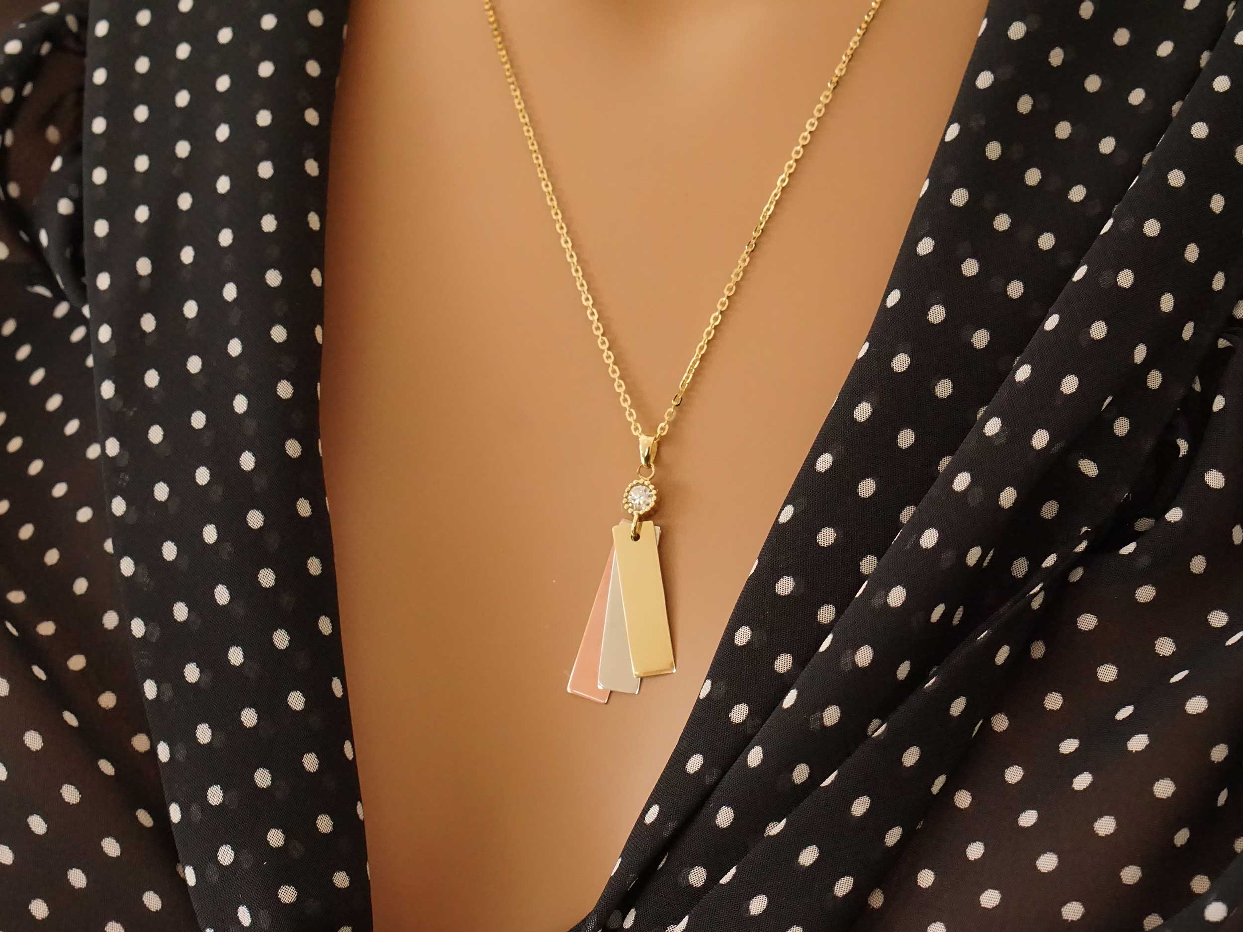 Μοναδικό τρίχρωμο χρυσό μενταγιόν 14 Καρατίων, με λουστρέ φινίρισμα. Το χρώμα του μετάλλου του είναι κίτρινο χρυσό, ροζ χρυσό και λευκόχρυσο και κοσμείται με μια με μια λαμπερή cubic ζιργκόν πέτρα σε λευκό χρώμα. Το συνολικό μήκος του είναι 3,60 cm. Συνδυάστε το με μια χρυσή αλυσίδα 14Κ.