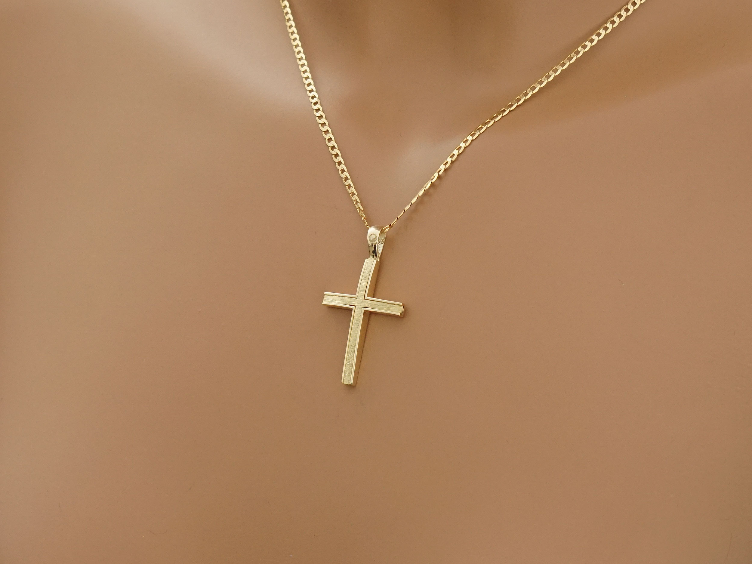 Υπέροχος βαπτιστικός σταυρός χρυσός 14 Καρατίων, με άψογο συνδυασμό λουστρέ και ζαγρέ φινιρίσματος. Το συνολικό μήκος του είναι 3,10 cm. Συνδυάζεται ιδανικά με τις χρυσές αλυσίδες 14Κ της συλλογής μας.