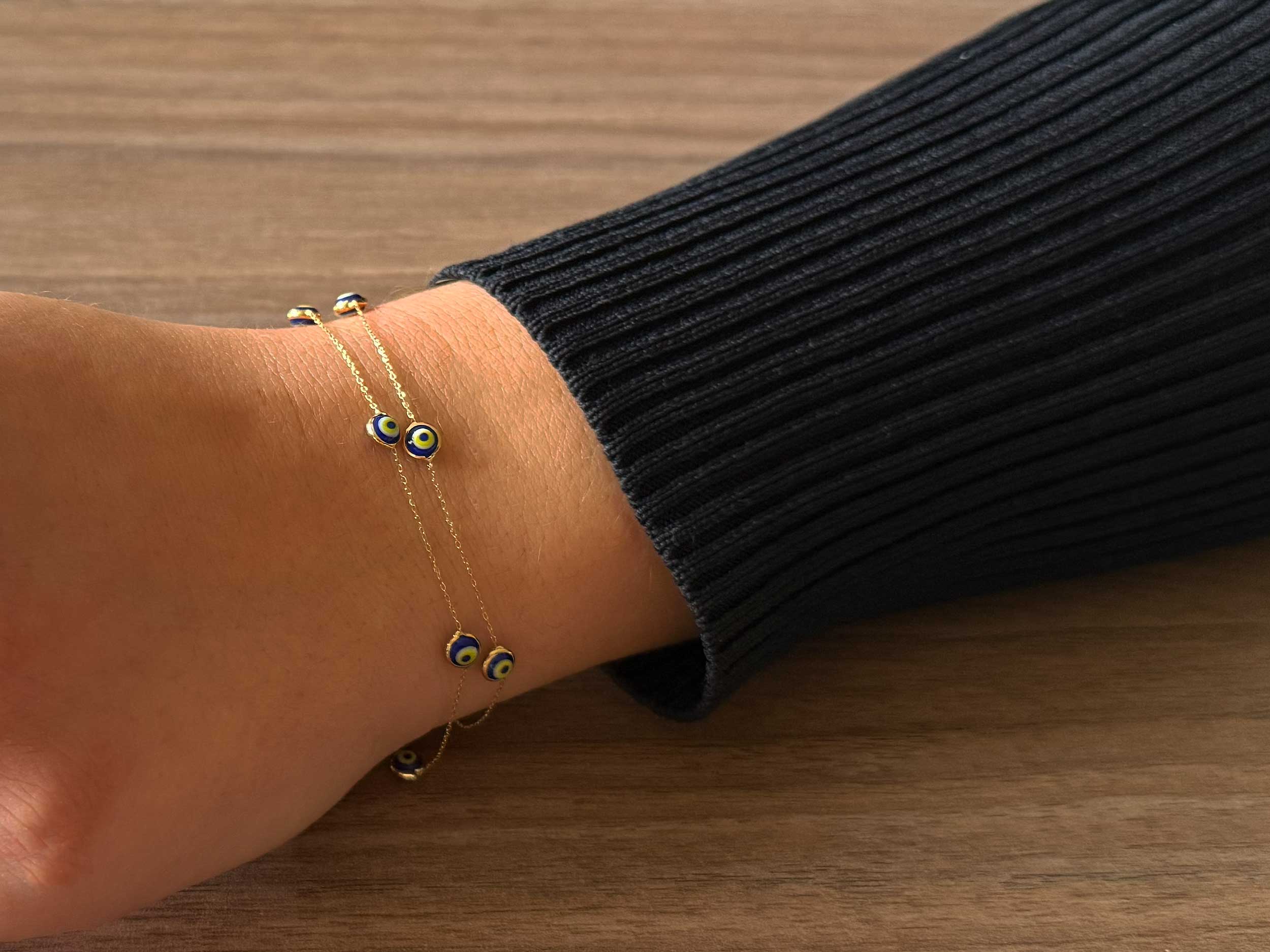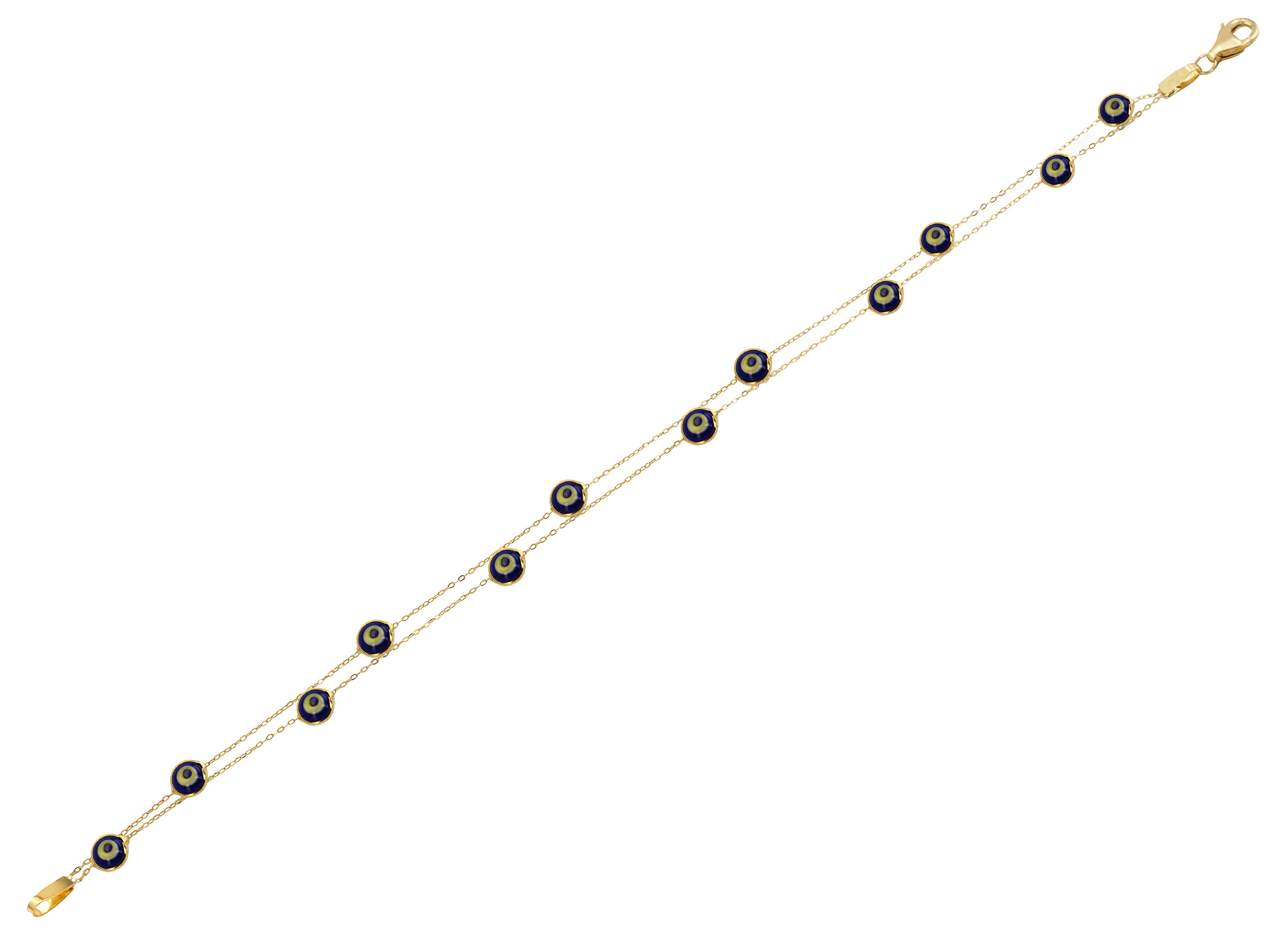 Βραχιόλι αλυσίδα με ματάκια από σμάλτο, σε χρυσό 14 Καρατίων. Ο συνδυασμός του χρυσού με το διαχρονικό σχέδιο του ματιού και τη διπλή αλυσίδα το καθιστά μοντέρνο και κομψό.