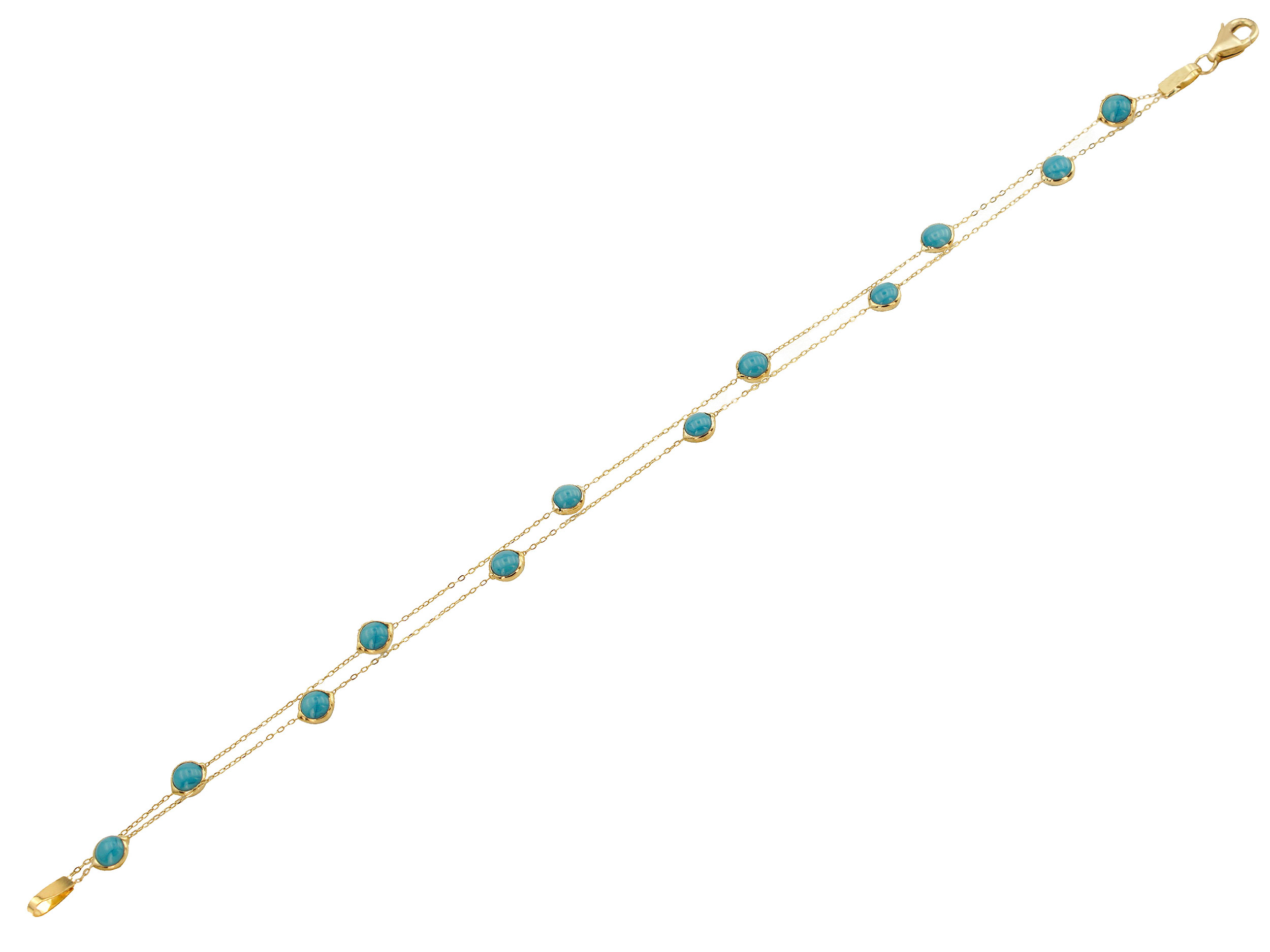 Διπλό βραχιόλι αλυσίδα με τιρκουάζ πέτρες, σε χρυσό 14 Καρατίων. Ο συνδυασμός του χρυσού με το έντονο χρώμα των τιρκουάζ πετρών προσδίδει μια αίσθηση φινέτσας και ζωντάνιας.