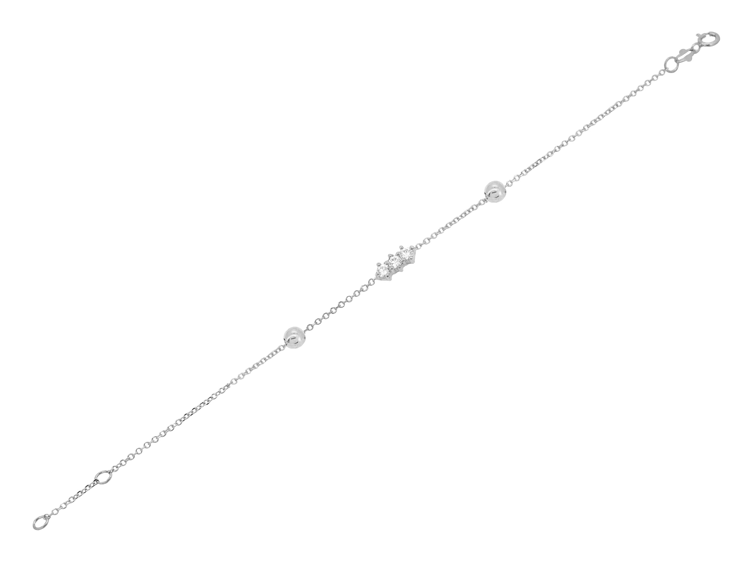 Βραχιόλι λευκόχρυσο γυναικείο 9 Καρατίων. Κοσμείται με τρεις λευκές cubic ζιργκόν πέτρες και δύο λουστρέ μπίλιες. Το συνολικό μήκος του είναι 17,50 cm. Φορέστε το μόνο του ή συνδυάστε το με περισσότερα βραχιόλια για να πετύχετε ένα υπέροχο layering.