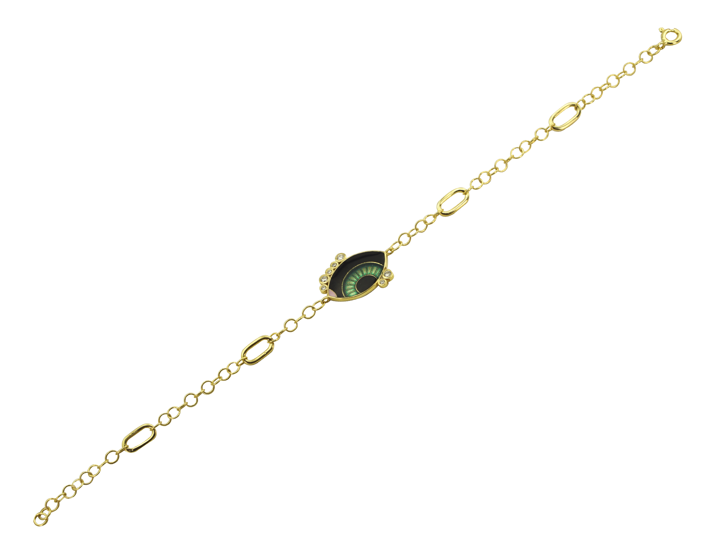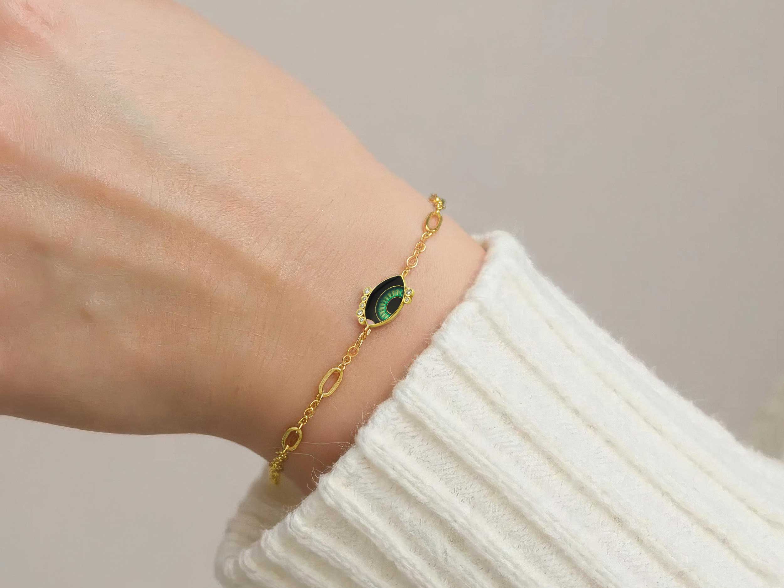 Βραχιόλι με μάτι από επιχρυσωμένο ασήμι 925 και λουστρέ φινίρισμα. Το βραχιόλι κοσμείται από ένα μάτι από σμάλτο και λαμπερές cubic ζιργκόν πέτρες σε λευκό χρώμα. Προτιμήστε το για αξέχαστες εμφανίσεις.